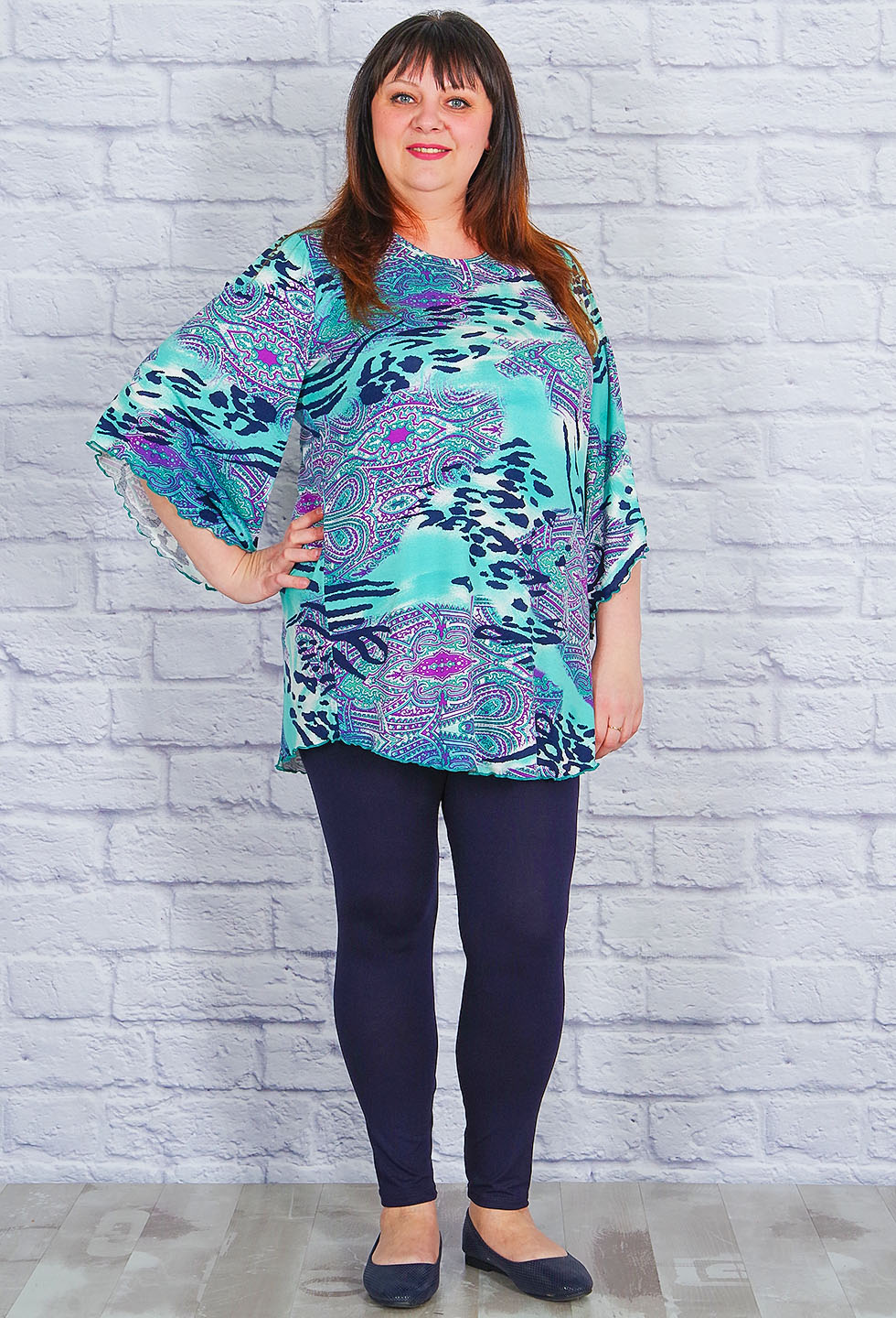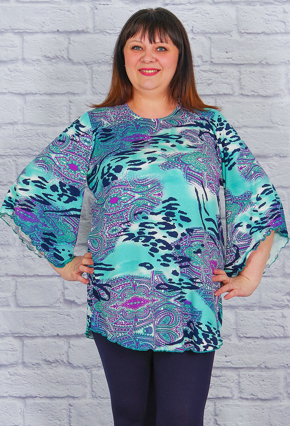 Яркая блузка для дам с пышными формами. Оригинальный крой рукава делает модель эффектной, комфортная длина прикрывает бёдра.
