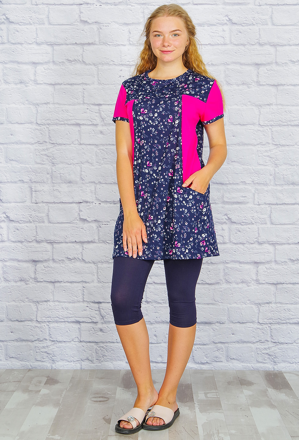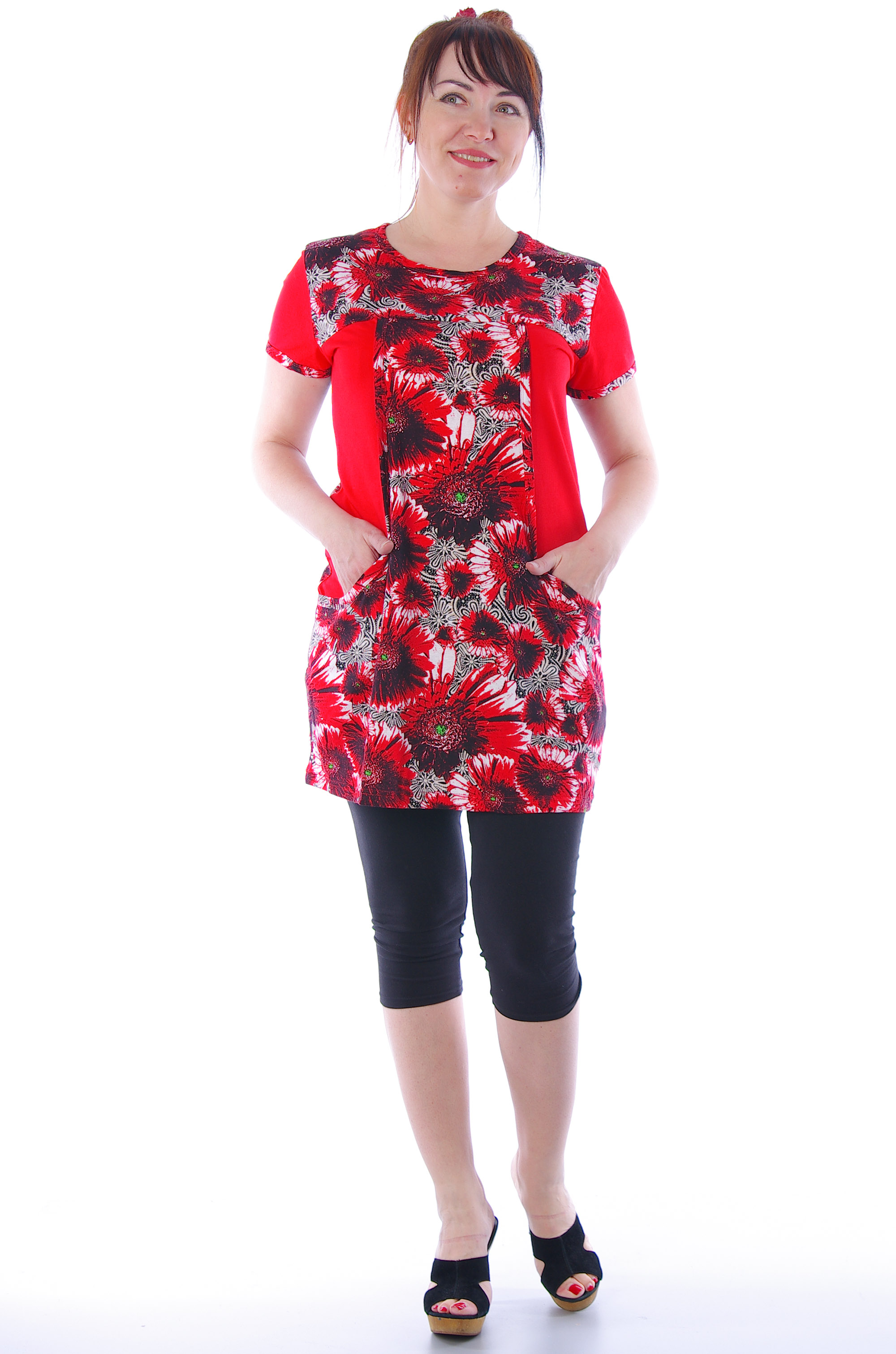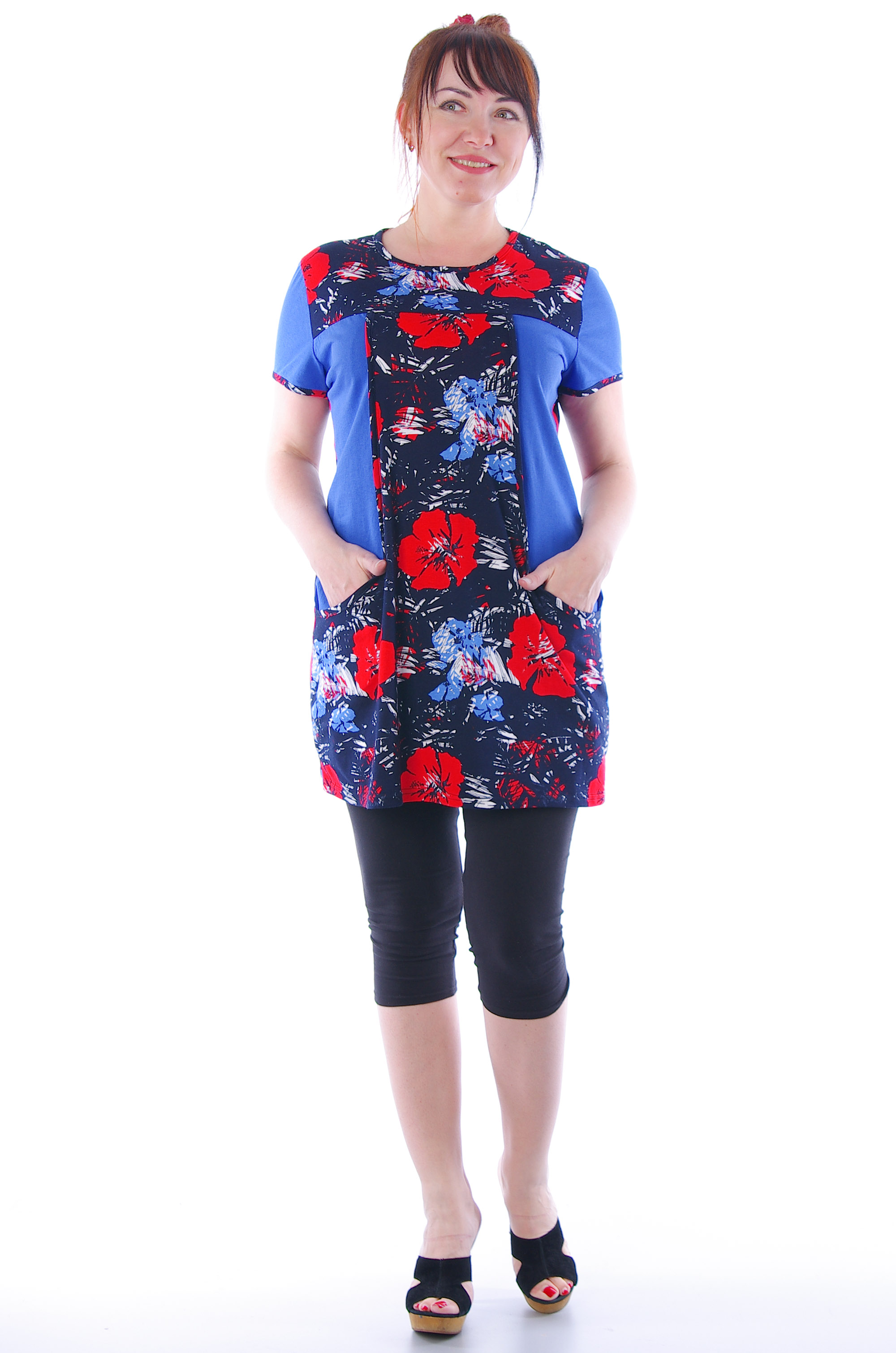 Удобная на каждый день комбинированная удлинённая туника оригинального кроя, с карманами. Выполнена из трикотажного кулирного полотна.