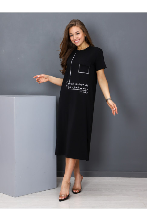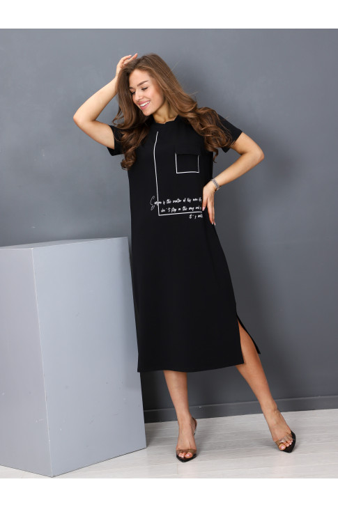 Длина миди, два боковых кармана, имитация кармана с клапаном, боковые шаговые разрезы и текстовый принт