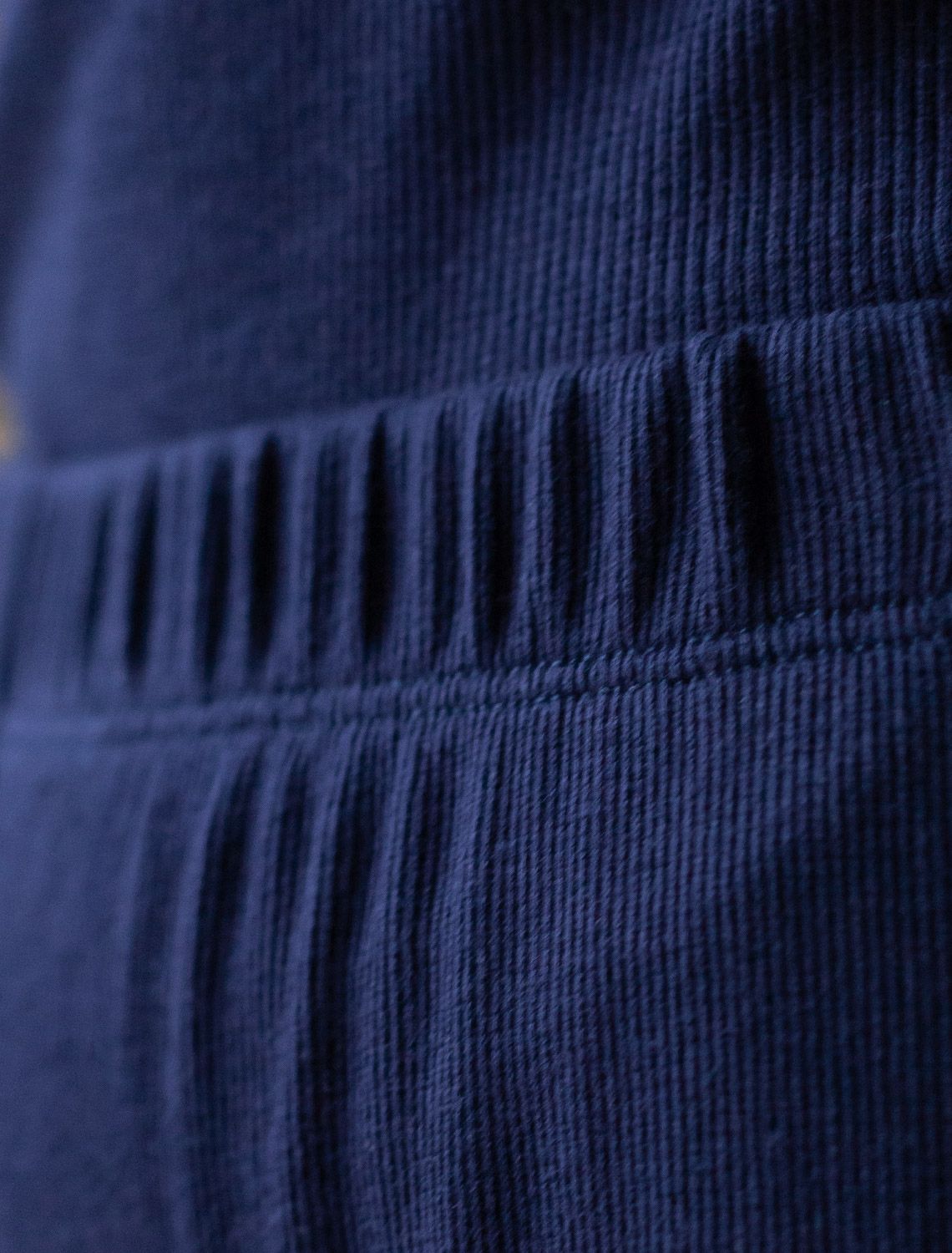 Короченные прямые брюки темно-синего цвета с поясом на тонкой резинке из фактурного трикотажа в рубчик созданы для вашего ежедневного комфорта. Невероятно комфортные и легкие, они создают ощущение нежного прикосновения к коже благодаря тонкой структуре материала. Особое внимание уделено поясу на резинке, который обеспечивает удобную посадку без давления и дискомфорта даже на большие размеры. На поясе отделка из тонкого кружева, что придает брюкам изящность и утонченность. Такие домашние капри отлично подойдут для отдыха дома благодаря свободному крою, облегчающему движения даже в течение длительного времени. Выбирая эти штаны, вы получаете удобство и стиль в одном решении, ведь домашние и повседневные задачи будут проходить с максимальным комфортом. Красивые брюки сохранят свой внешний вид даже при активной эксплуатации, ткань не теряет форму. Брюки подходят для создания уютного образа на каждый день, легко сочетаются с другими предметами гардероба для прогулок и уютных вечеров. Приятная рельефная фактура ткани и аккуратный дизайн создают баланс между стилем и удобством, что особенно важно при выборе повседневных брючек.