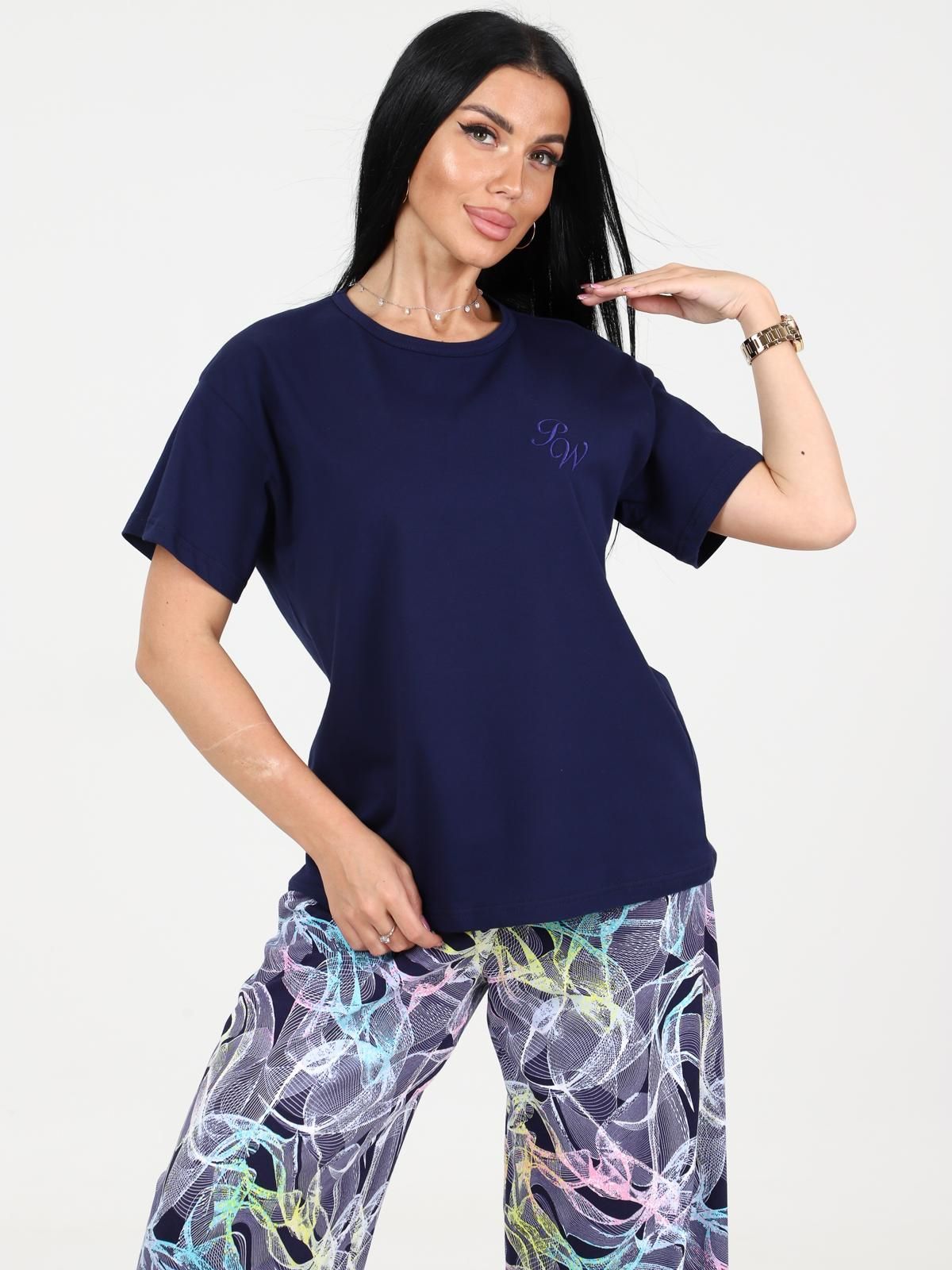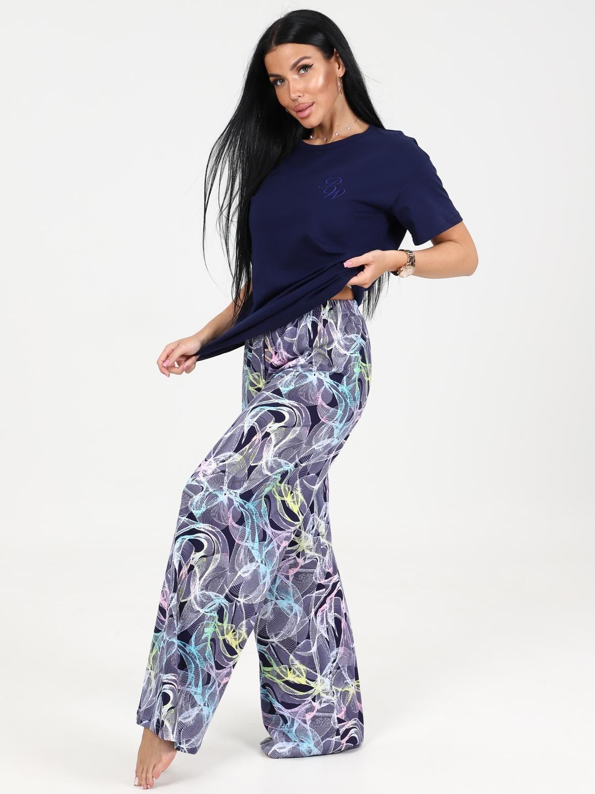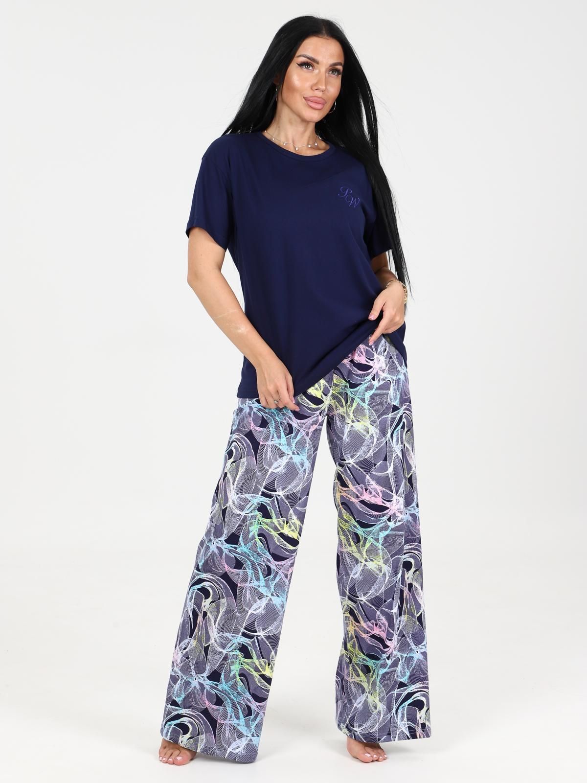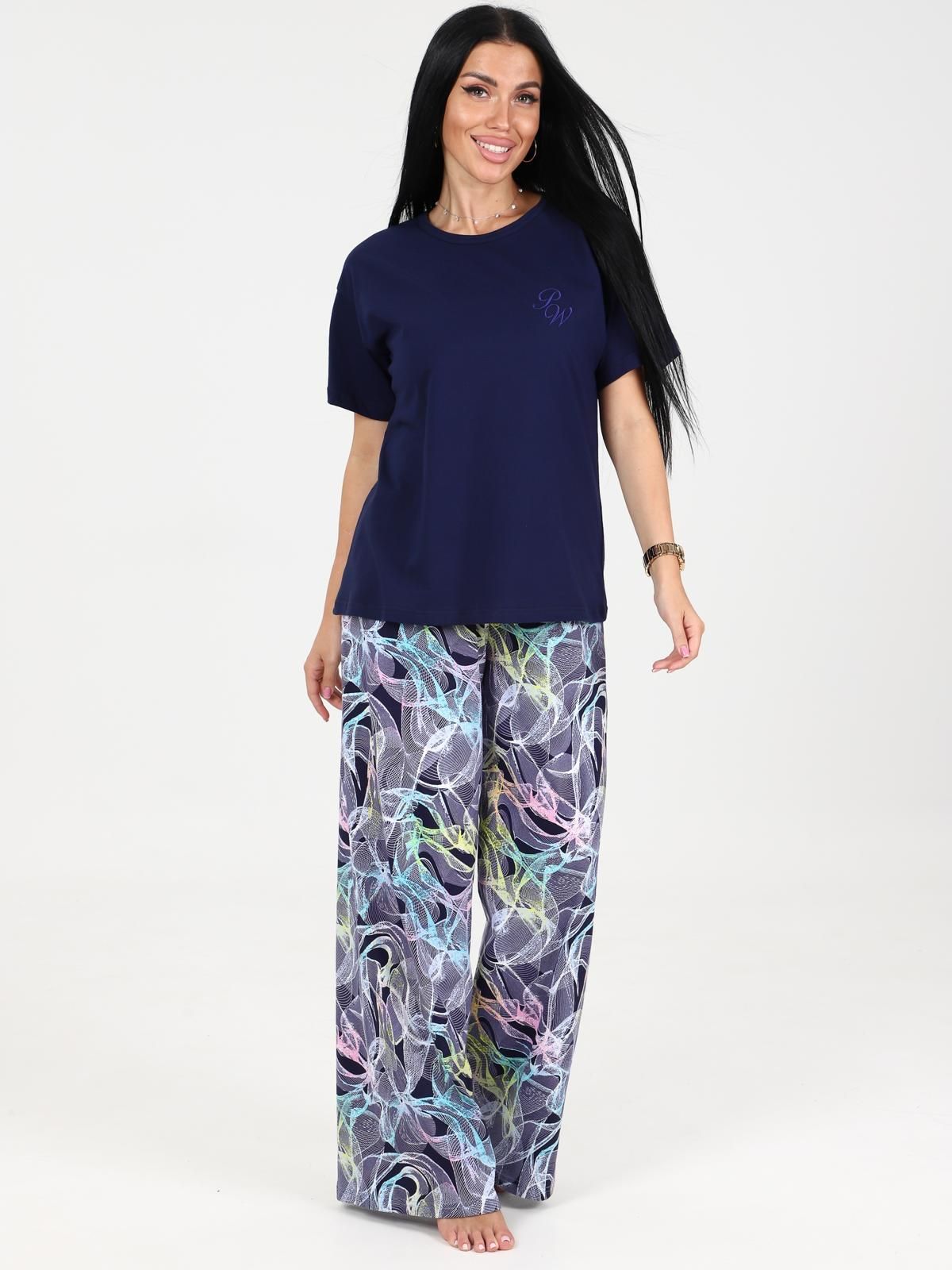 Пижама выполнена из хлопка 100%. Футболка свободного кроя, горловина обработана окантовкой, на груди элегантная вышивка. Брюки палаццо, свободные, без карманов.