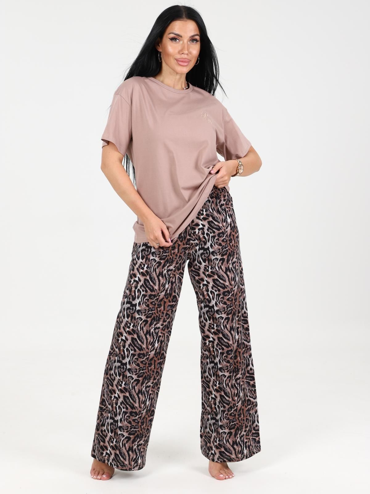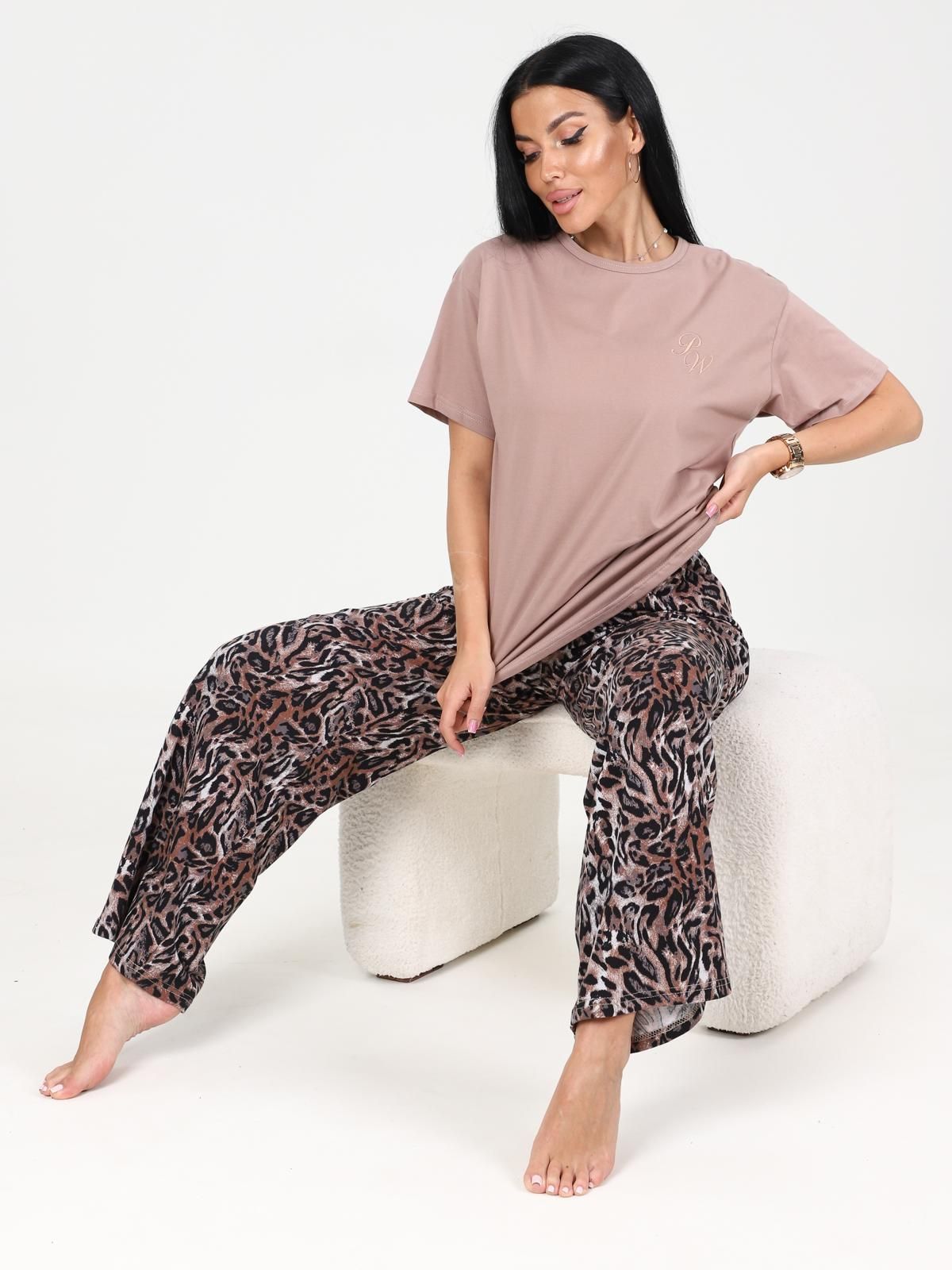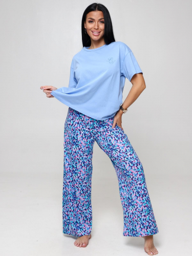 Пижама выполнена из хлопка 100%. Футболка свободного кроя, горловина обработана окантовкой, на груди элегантная вышивка. Брюки палаццо, свободные, без карманов.