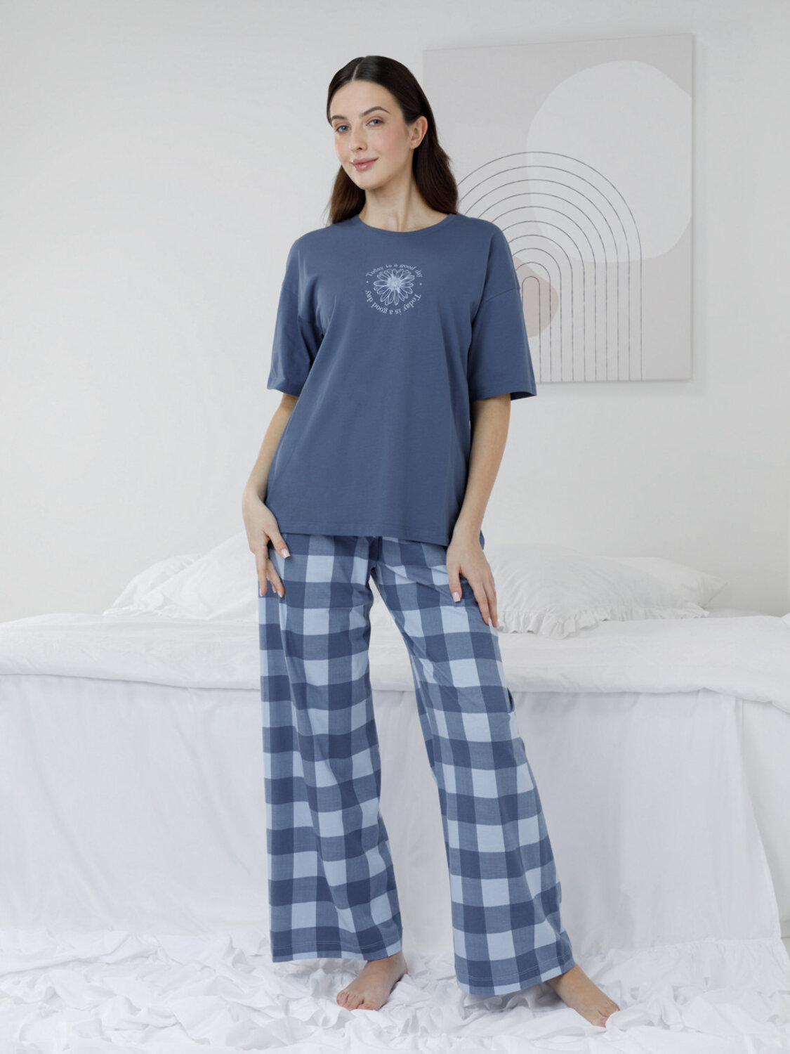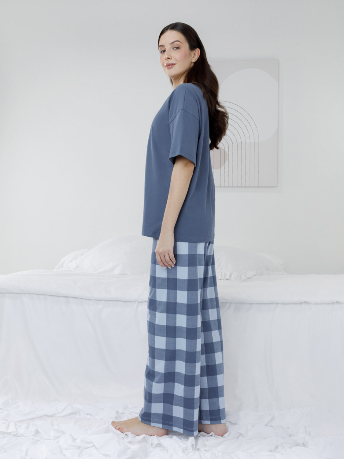 Комплект для комфортного сна и отдыха из гладкого трикотажного полотна. Футболка с короткими спущенными рукавами и прямые брюки с мягкой эластичной резинкой в поясе, которые удобно садятся по фигуре. Лёгкий материал приятен к телу, не теряет форму и позволяет коже дышать. Все трикотажные полотна производятся в соответствии с нормами швейцарского сертификата ЭкоТекс.