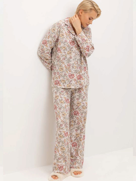 Бежевый/Античные_Цветы 104, 108 Комплект для комфортного сна и отдыха из набивного трикотажа из 100% натурального хлопка. Рубашка с длинными рукавами на пуговицах. Брюки с мягким поясом на резинке. Гладкий материал приятен к телу, не теряет форму и позволяет коже дышать. Гипоаллергенные красители. 100% хлопок супрем