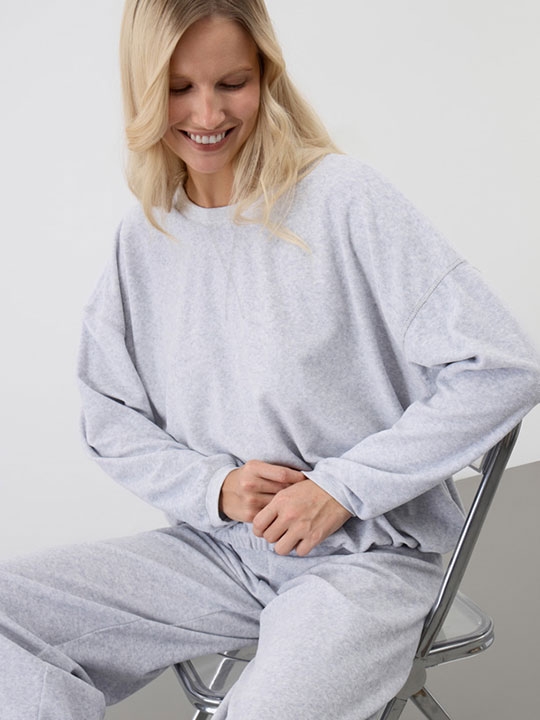 Св.серый_меланж 088, 096, 100, 104 Пижама из джемпера с длинным рукавом и свободных брюк. Выполнена из нежного велюра. 55% хлопок, 45% п/э