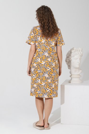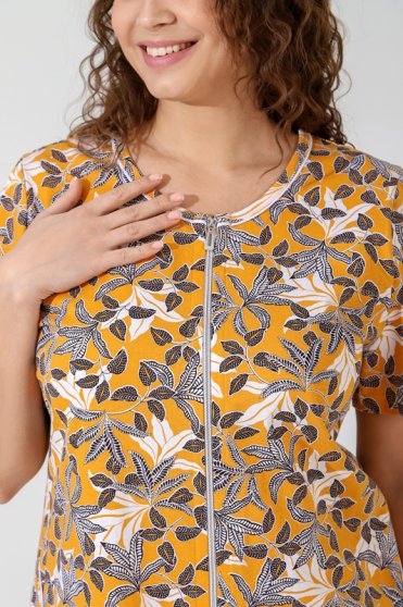 Оптовая продажа. Халат женский из трикотажного полотна кулирная гладь с набивным цветочным рисунком, средней длины, прямой, свободного кроя, с короткими втачными рукавами, овальным вырезом горловины, карманами в боковых швах, центральной застежкой на молнию. Горловина и входы в карманы окантованы двойным кантом. Удобный свободный крой дарит комфорт и ощущение свободы движений. Одежда из хлопка комфортна и приятна для кожи, дышащая и легкая, длительное время не разрушается под влиянием воды. Рекомендуется бережная стирка при 30С.