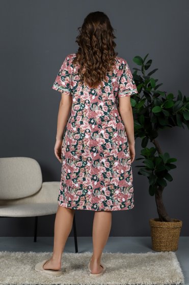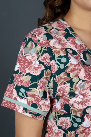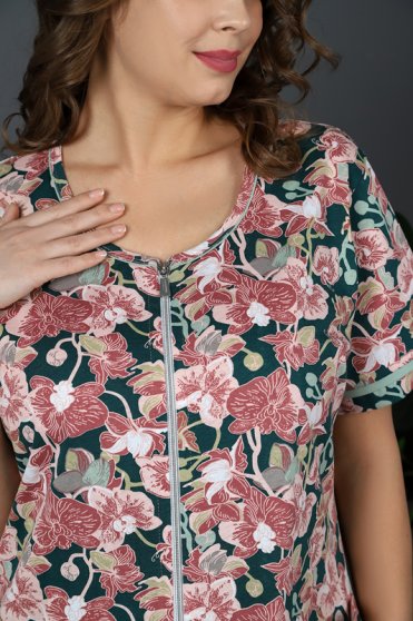 Оптовая продажа. Халат женский из трикотажного полотна кулирная гладь с набивным цветочным рисунком в виде веточек орхидей, прямого силуэта, короткими втачными рукавами, U –образным вырезом горловины, центральной застежкой на молнию, двумя накладными карманами на уровне бедер, разрезами в боковых швах. Притачные детали манжет рукавов, карманов и окантовка горловины выполнены из материалов двух цветов. Удобный свободный крой дарит комфорт и ощущение свободы движений. Одежда из хлопка комфортна и приятна для кожи, дышащая и легкая.
