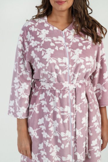 Оптовая продажа. Халат женский из трикотажного полотна “велсофт” с набивным цветочным рисунком, прямого силуэта, с втачными рукавами ? длины, воротником стойкой, центральной застежкой на молнию, карманами в боковых швах. Модель комплектуется поясом, завязывающимся на талии. Ткань обладает исключительной мягкостью и приятной текстурой, добавляя изделию изящности и роскоши, создает ощущение комфорта и уюта. Обладает хорошими теплоизоляционными свойствами, что делает его отличным выбором для холодного времени года.