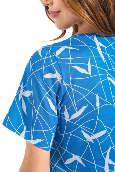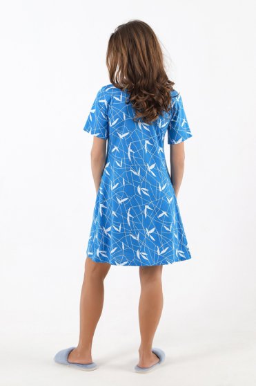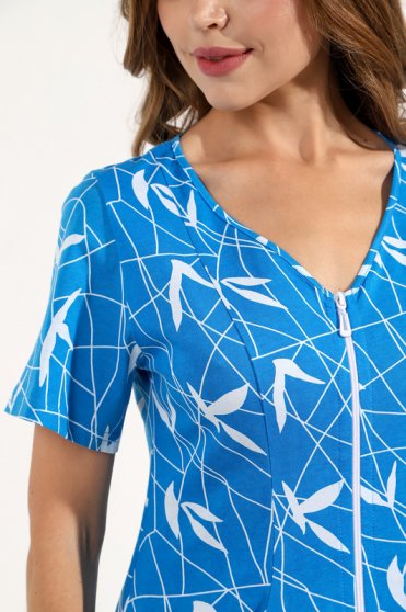 Оптовая продажа. Халат молодежный из трикотажного полотна кулирная гладь с набивным рисунком по всему полотну, прямой, свободного кроя, укороченный, расширенный книзу, с короткими втачными рукавами, V-образным вырезом горловины, обработанной основным материалом, центральной застежкой на молнию, накладными карманами, полочки с рельефами. Удобный свободный крой дарит комфорт и ощущение свободы движений. Одежда из хлопка комфортна и приятна для кожи, дышащая и легкая, длительное время не разрушается под влиянием воды. Рекомендуется бережная стирка при 30С.