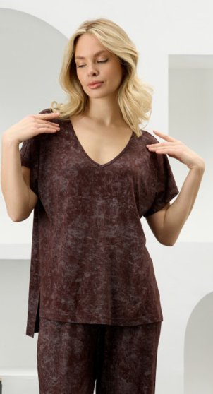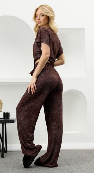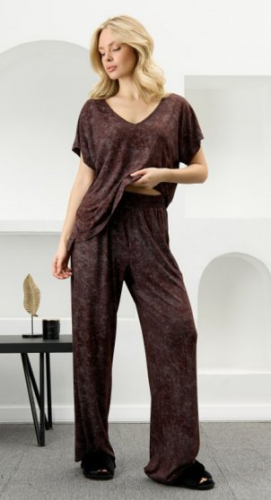 Оптовая продажа. Костюм женский в комбинации двух видов полотен: из гладкокрашенного трикотажного вискозного полотна с эффектом «варенка», состоящий из футболки и брюк. Футболка - свободного покроя, с короткими цельнокроеными рукавами, горловиной V-образной формы, окантованной основным материалом и разрезами в боковых швах. Модной деталью является разница длин между полочкой и спинкой.Брюки – длинные, свободные, на притачном поясе с эластичной тесьмой внутри.