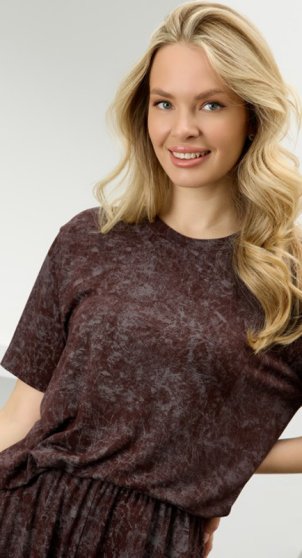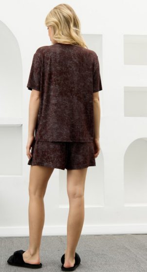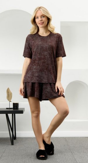 Оптовая продажа. Костюм женский в комбинации двух видов полотен: из гладкокрашенного трикотажного вискозного полотна с эффектом «варенка», состоящий из футболки и шорт. Футболка - классического покроя, с короткими втачными рукавами, горловиной овальной формы, обработанной втачной планкой.Шорты – свободные, средней длины, с эластичной тесьмой по талии.