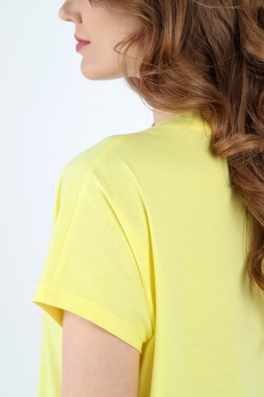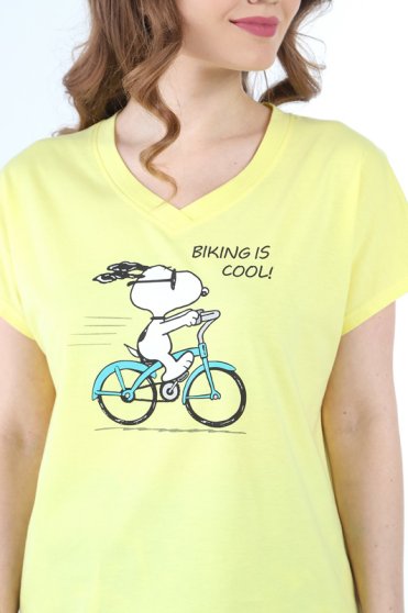 Оптовая продажа. Комплект женский из трикотажного полотна, состоящий из футболки и шорт. Футболка – из гладкокрашеного полотна, с короткими цельнокроеными рукавами, горловиной V-образной формы, обработанной втачной планкой и принтом "Собачка на велосипеде" на полочке. Шорты - из полотна с абстрактным рисунком, средней длины на широком притачном поясе с эластичной тесьмой внутри, с двумя карманами в боковых швах.