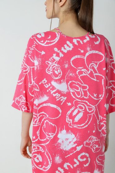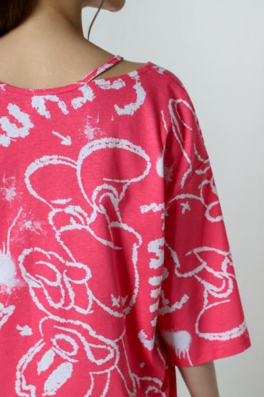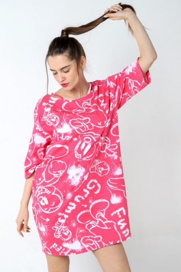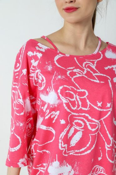 Оптовая продажа. Туника женская свободного силуэта, из полотна с рисунком эксклюзивного дизайна, эффектным решением горловины, со спущенной линией плеч и рукавами, чуть закрывающими локти.