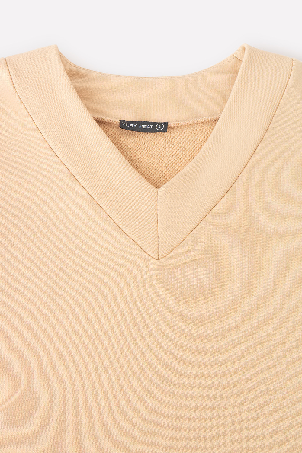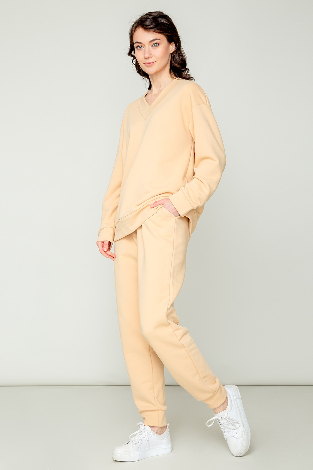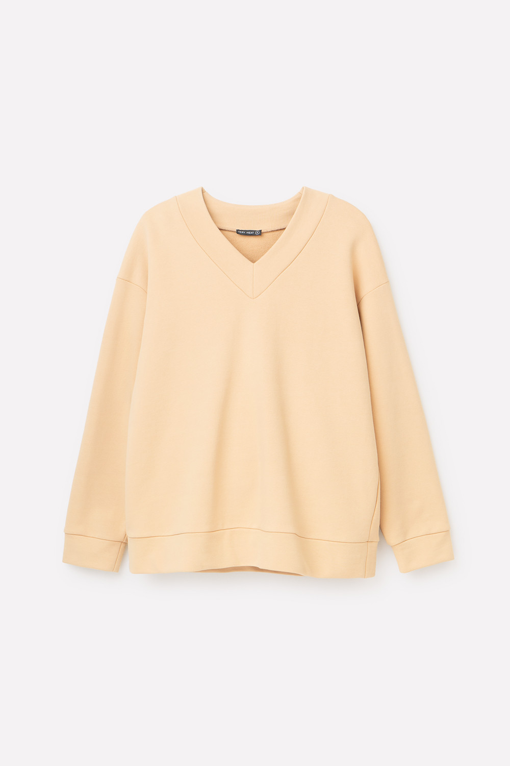 Мягкий однотонный джемпер с V-образным вырезом и длинными рукавами из мягкого петельчатого футер трёхнитка. Воротник, манжеты и пояс выполнены из основного полотна. В составе 80% натурального хлопка и 20% полиэстера, при этом полиэстер ввязан внутрь по особой технологии и не соприкасается с кожей. Свободная посадка и спущенные плечи придают джемперу объём.
