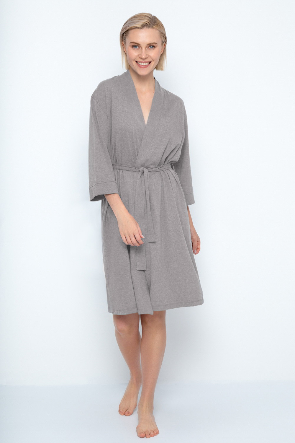 Уютный легкий халат из меланжевого трикотажа на запах с длинными рукавами. В боковых швах два удобных кармана. С помощью пояса можно регулировать посадку и силуэт. Гладкий материал приятен к телу и позволяет коже дышать.