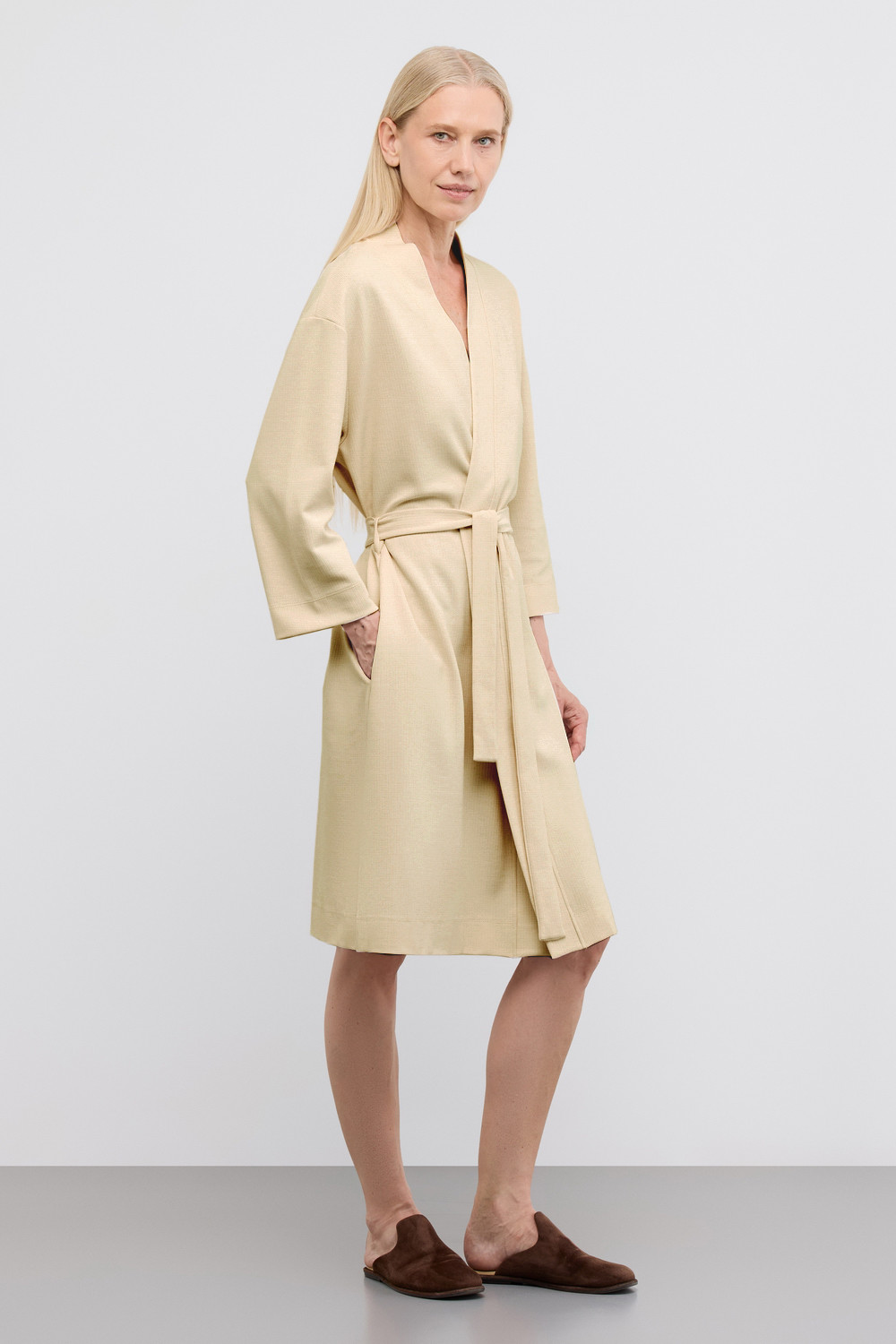 Халат из мягкого вафельного хлопка подарит атмосферу домашнего уюта и комфорта. Карманы добавляют изделию практичности.