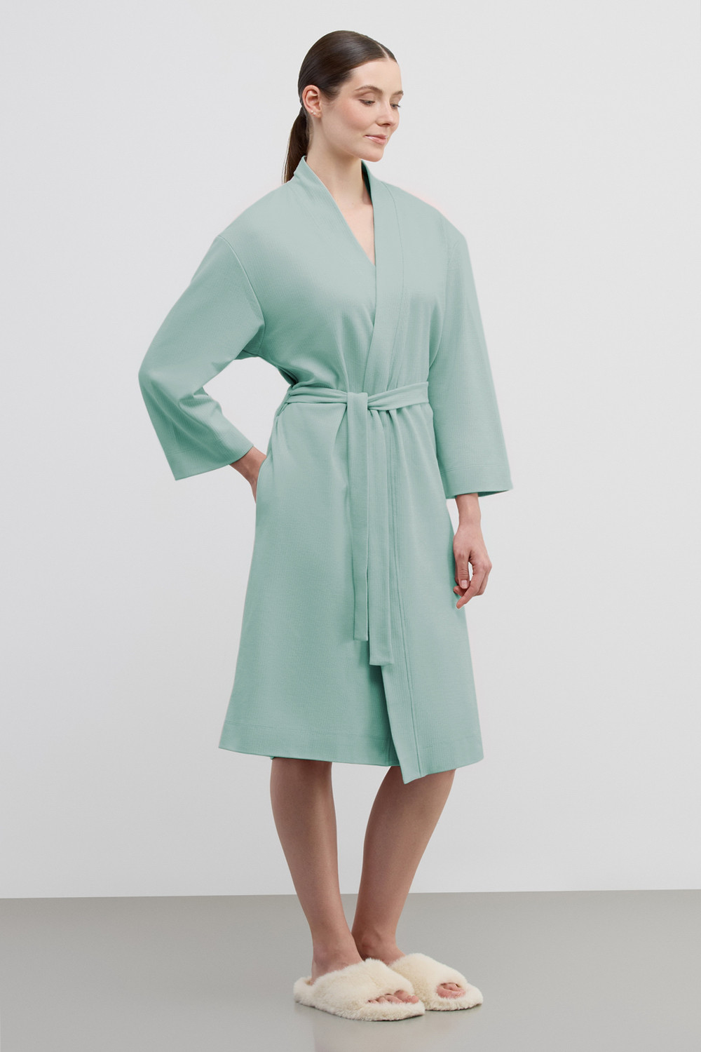 Халат из мягкого вафельного хлопка подарит атмосферу домашнего уюта и комфорта. Карманы добавляют изделию практичности.