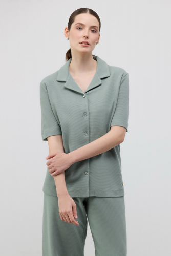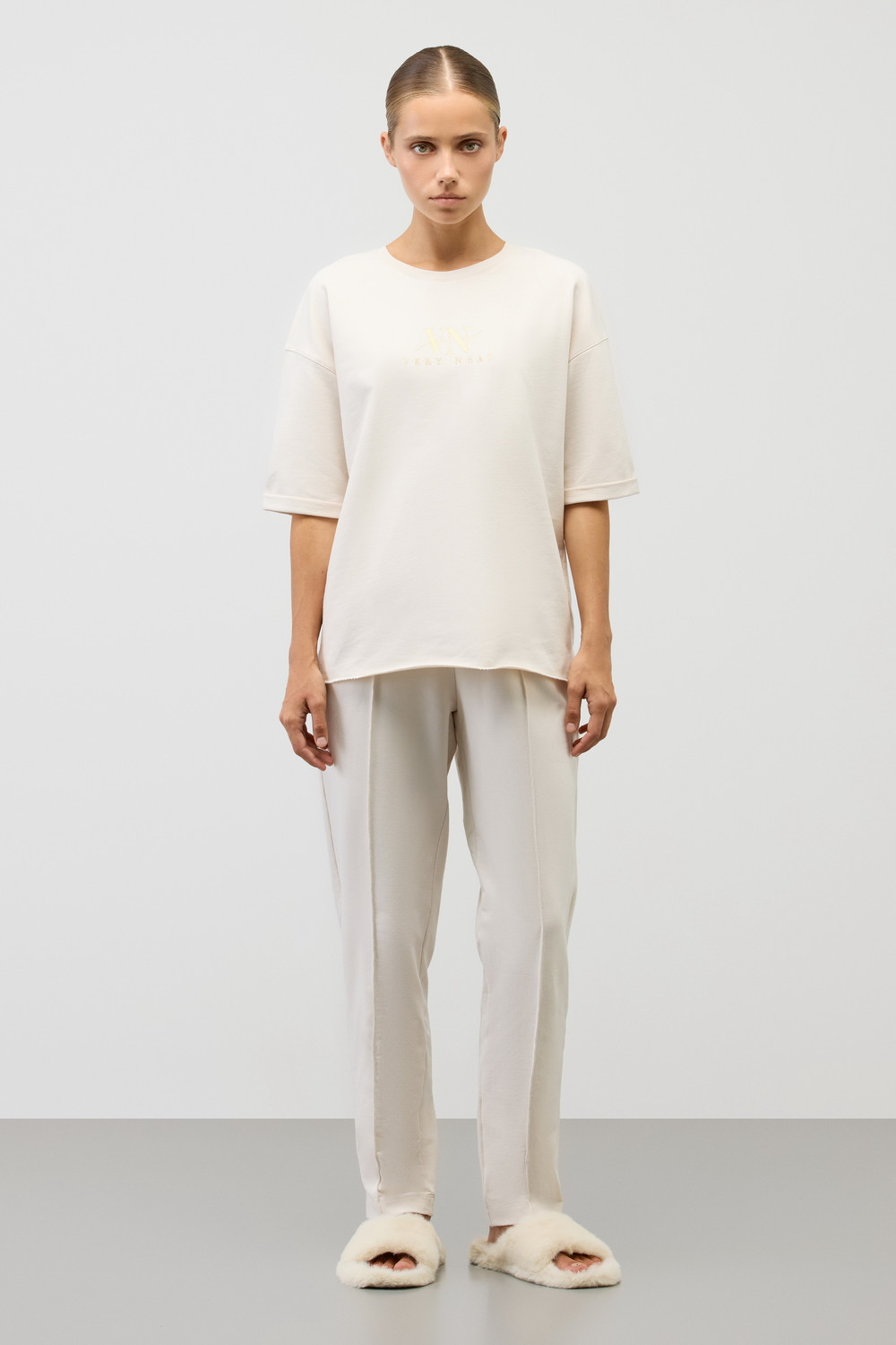 Комплект из петельчатого футера со спандексом. У футболки широкие, удобные рукава чуть выше локтя, а мягкий пояс брюк и хлопок в составе заставят вас влюбиться в его комфорт.