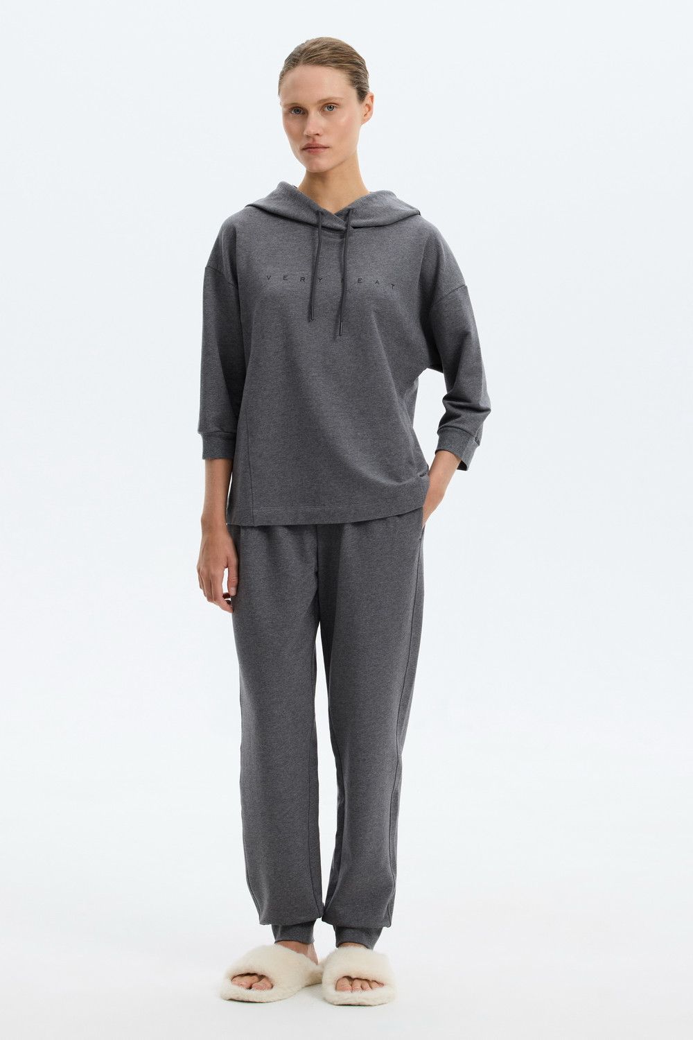Комплект из легкого футера. Зауженный крой брюк и джемпер с капюшоном созданы, чтобы придать максимальный комфорт домашнему отдыху.