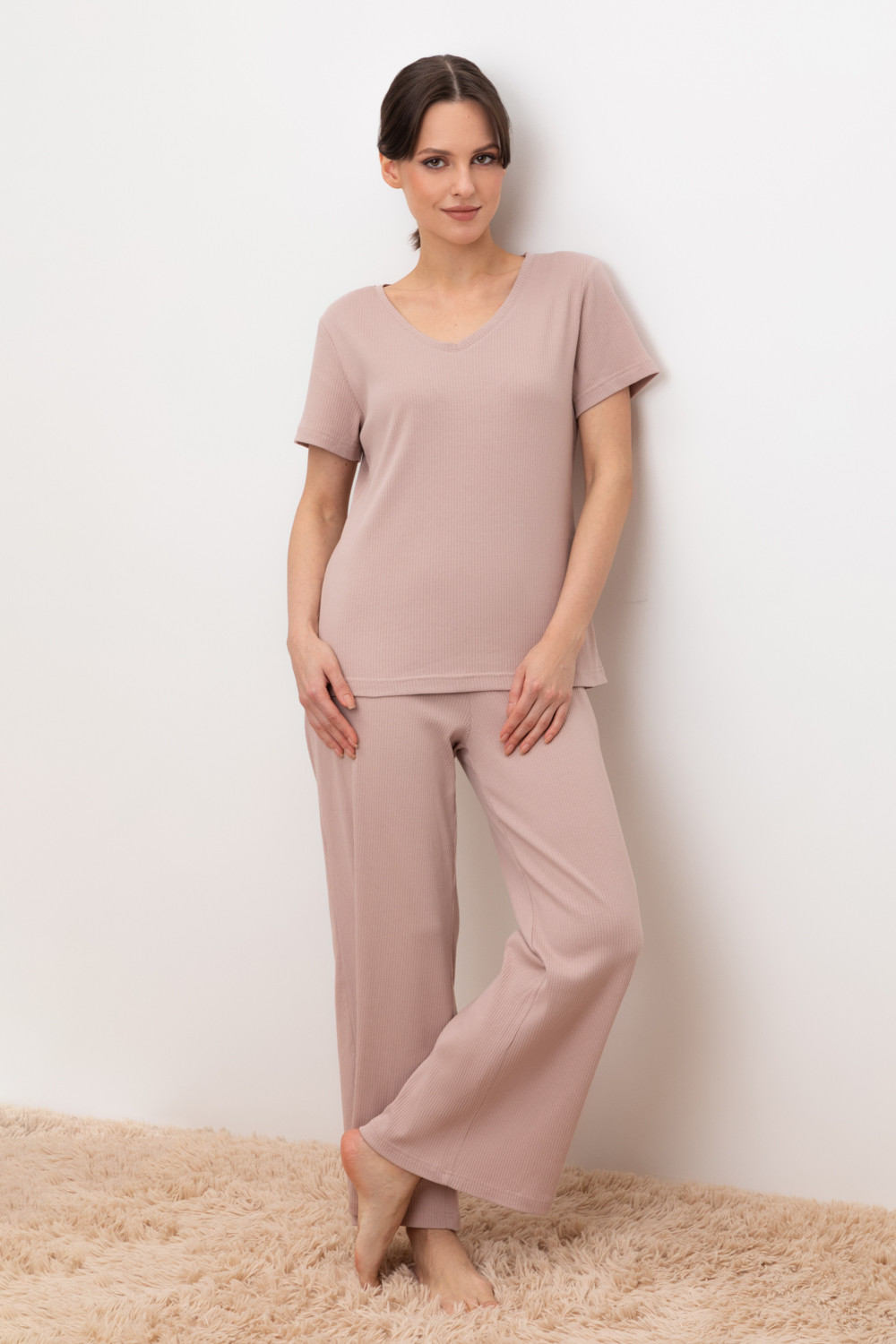 Комплект для комфортного сна и отдыха из трикотажного полотна в рубчик. Свободная футболка с V-образным вырезом. Брюки с мягким поясом на резинке удобно садятся по фигуре.