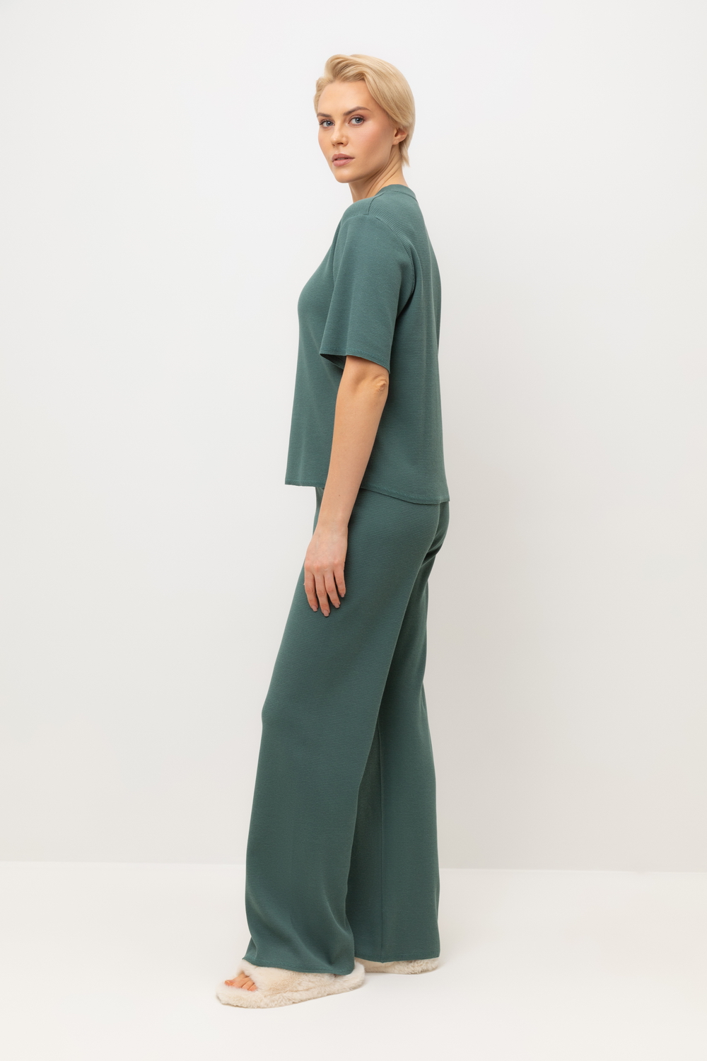 Комплект из объемного трикотажа с добавлением эластичных волокон. Свободный силуэт и мягкий пояс брюк обеспечат комфорт во время сна и отдыха.