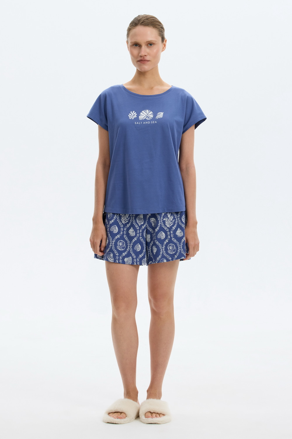 Комплект из высококачественного гребенного хлопка. Футболка имеет фигурный низ и цельнокроеный удобный рукав, а мягкий пояс шорт обеспечивает комфорт во время сна и отдыха.