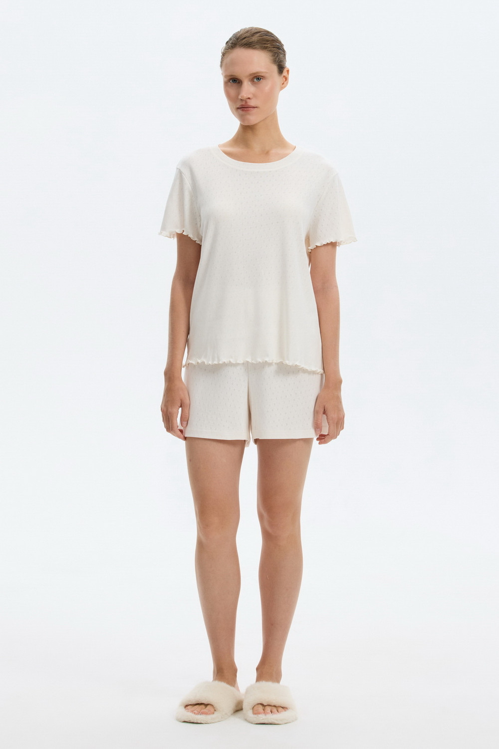 Комплект из 100% ажурного хлопка. Свободный силуэт и мягкий пояс обеспечат комфорт во время сна и отдыха. Края футболки обработаны мягким волнистым швом