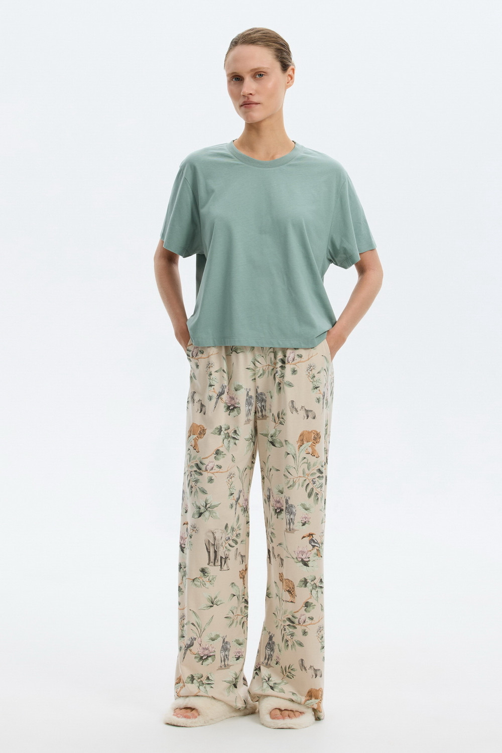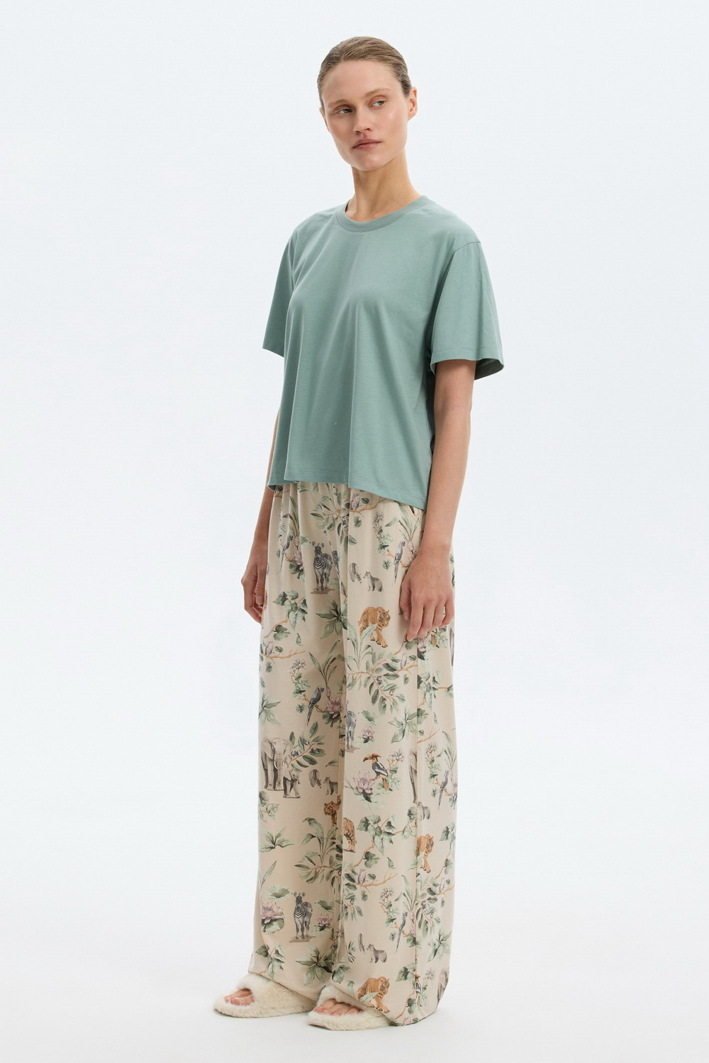 Комплект выполнен из хлопка с нежнейшим модалом. Свободный крой футболки и мягкий пояс брюк обеспечивают легкость и свободу движений.