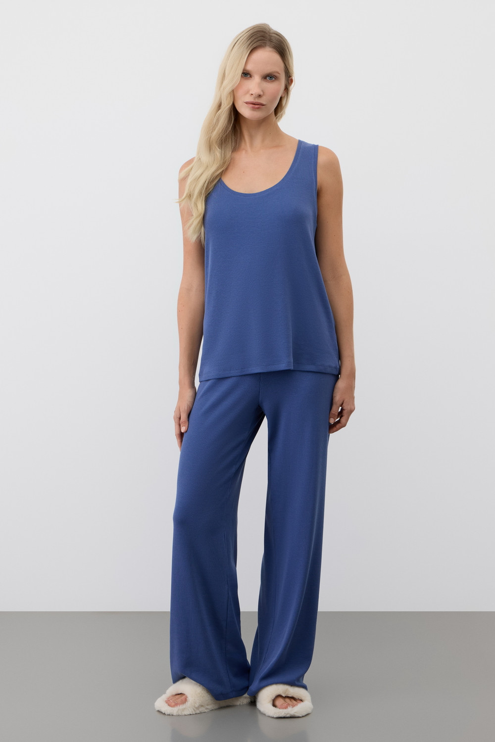 Комплект из нежного хлопкового трикотажа в рубчик с добавлением вискозы. Мягкий и эластичный на ощупь трикотаж обеспечивает легкость и приятное облегание.