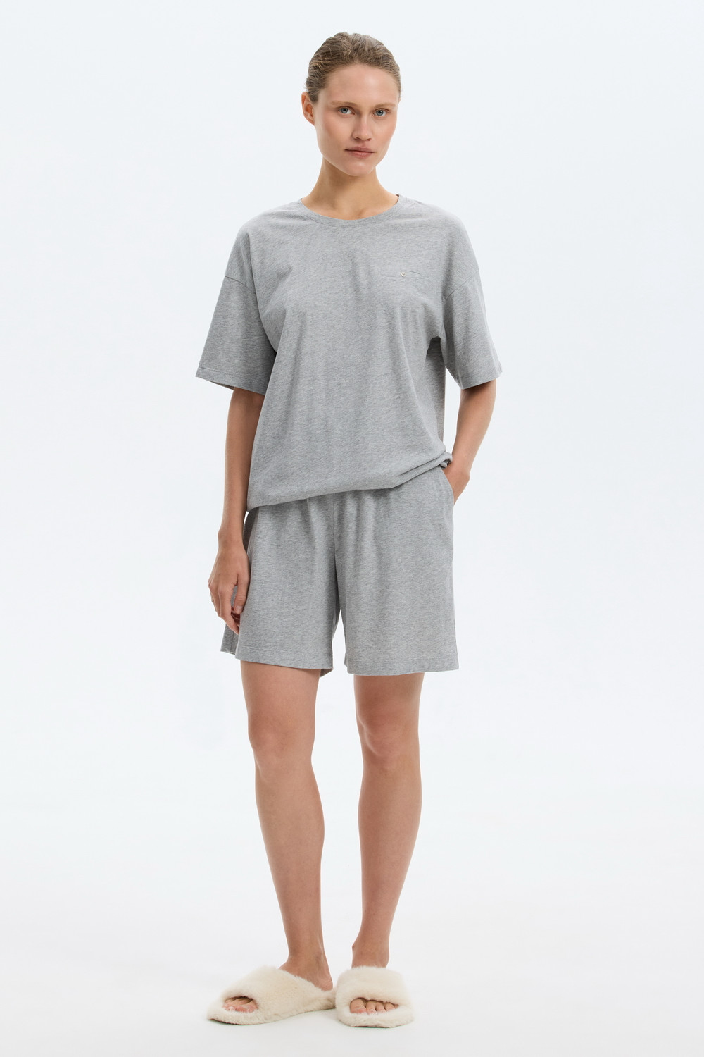 Комплект из 100% хлопка в цвете серый меланж. Шорты и свободная футболка обеспечат комфорт во время домашнего отдыха.