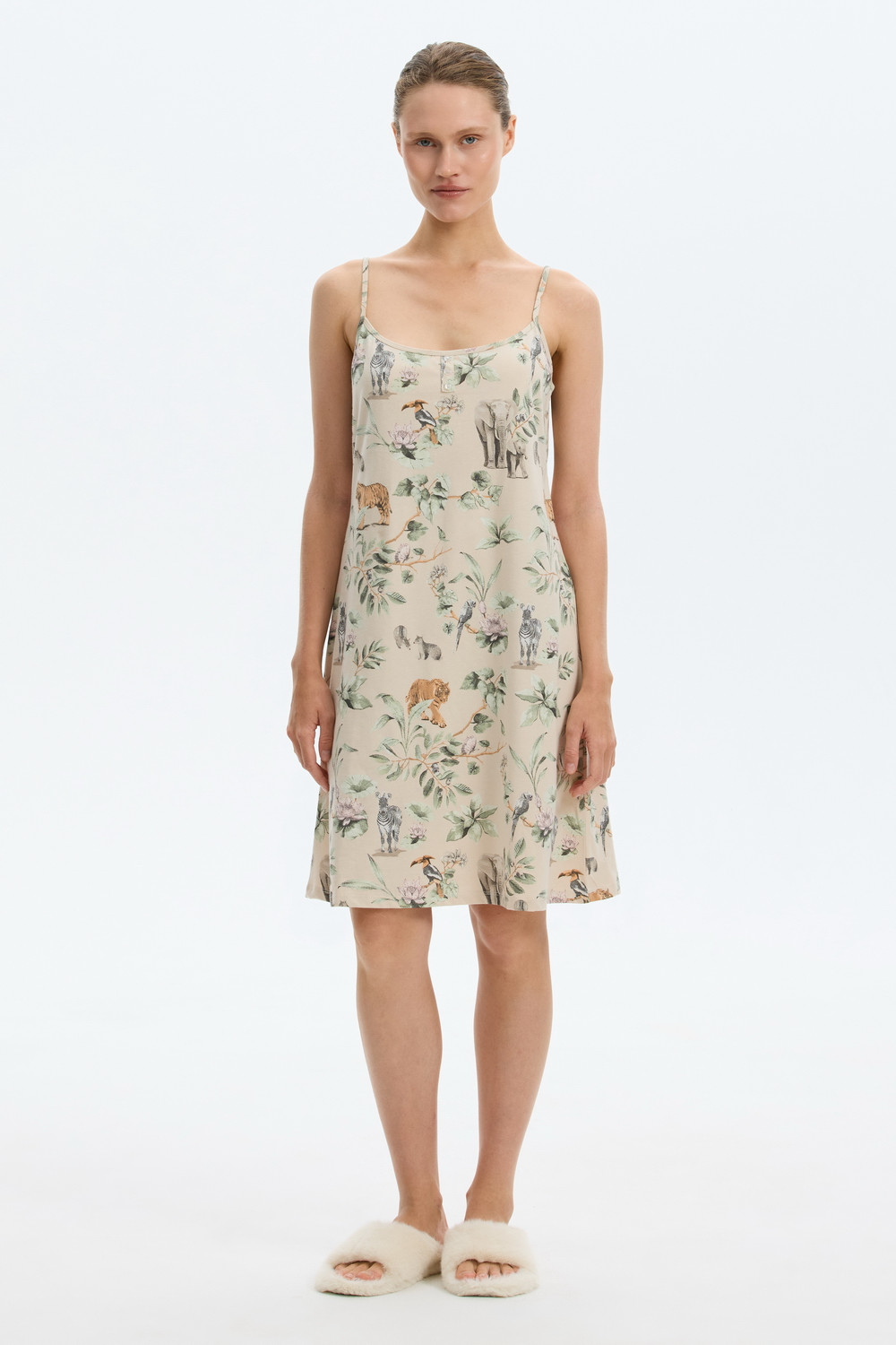 Сорочка из 100% хлопка. Регулируемые бретели позволяют подстроить их под ваши предпочтения, а удобный крой добавляет комфорта во время сна.