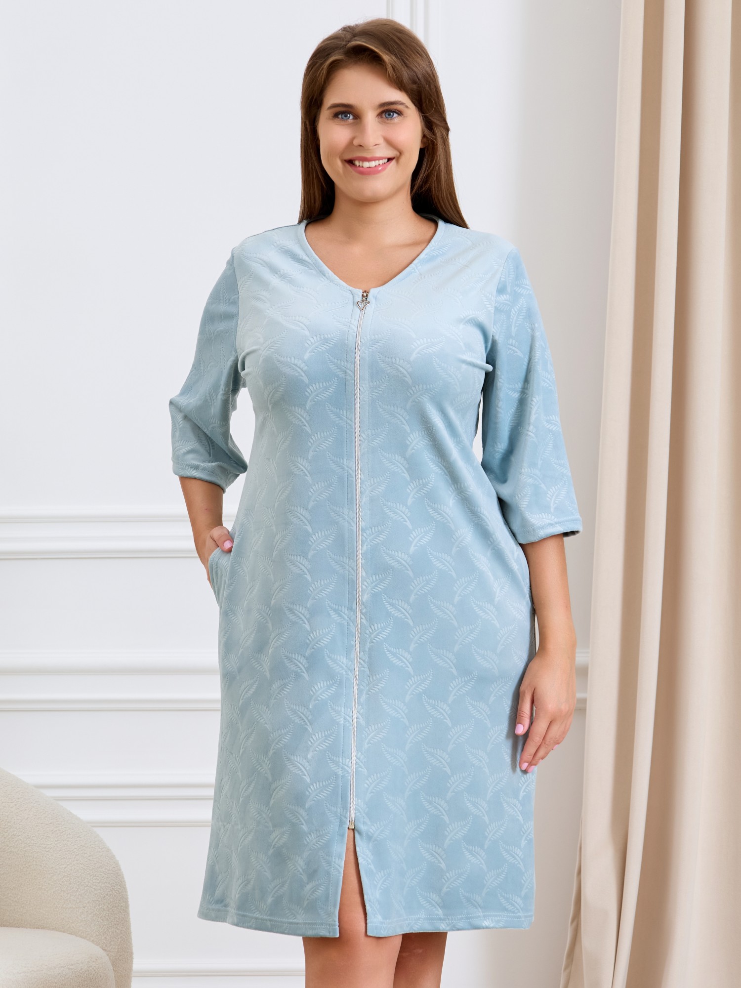Халат женский из гладкокрашеного полотна «велюр» с рисунком, выполненным тиснением на термопрессе. Изделие прямого силуэта, с втачными рукавами длиной ¾, горловиной овальной формы, карманами в боковых швах и центральной бортовой застежкой на тесьму «молния».