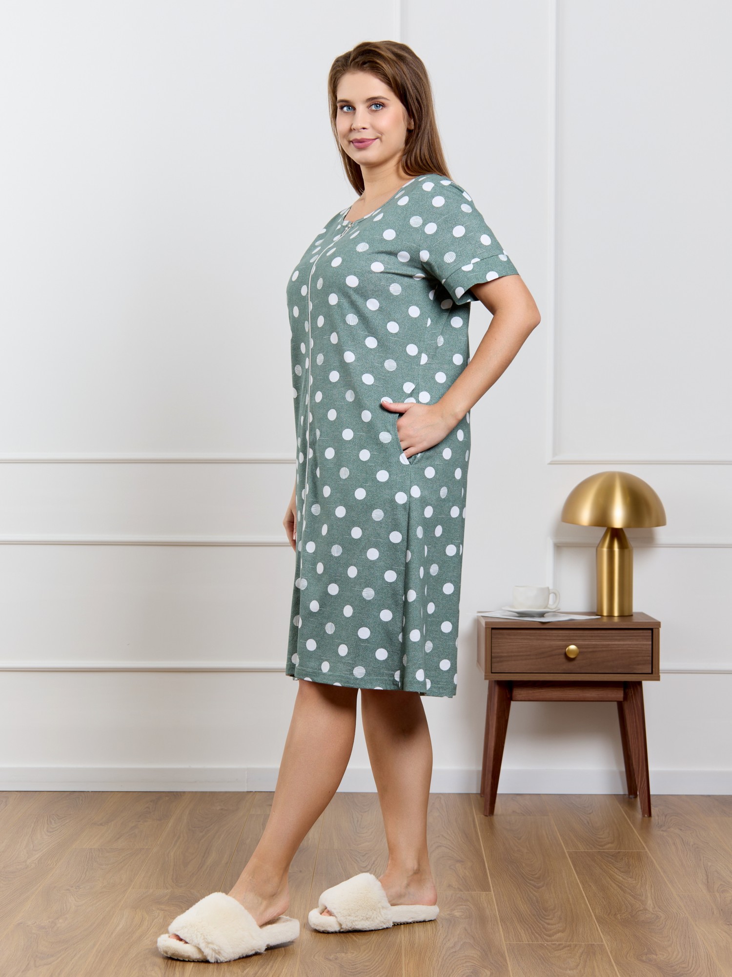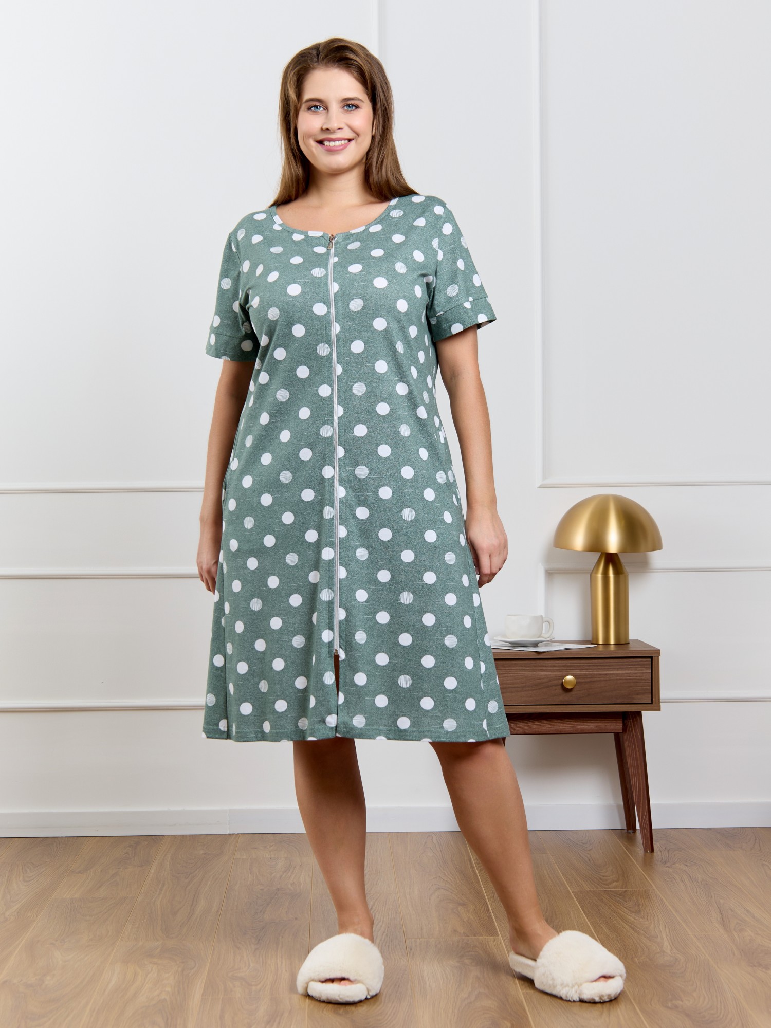 Халат женский из трикотажного полотна кулирка с набивным рисунком, прямого силуэта, с короткими втачными рукавами, обработанными манжетами, бортовой застежкой на тесьму «молния» и карманами в боковых швах. Горловина овальной формы окантована основным материалом.