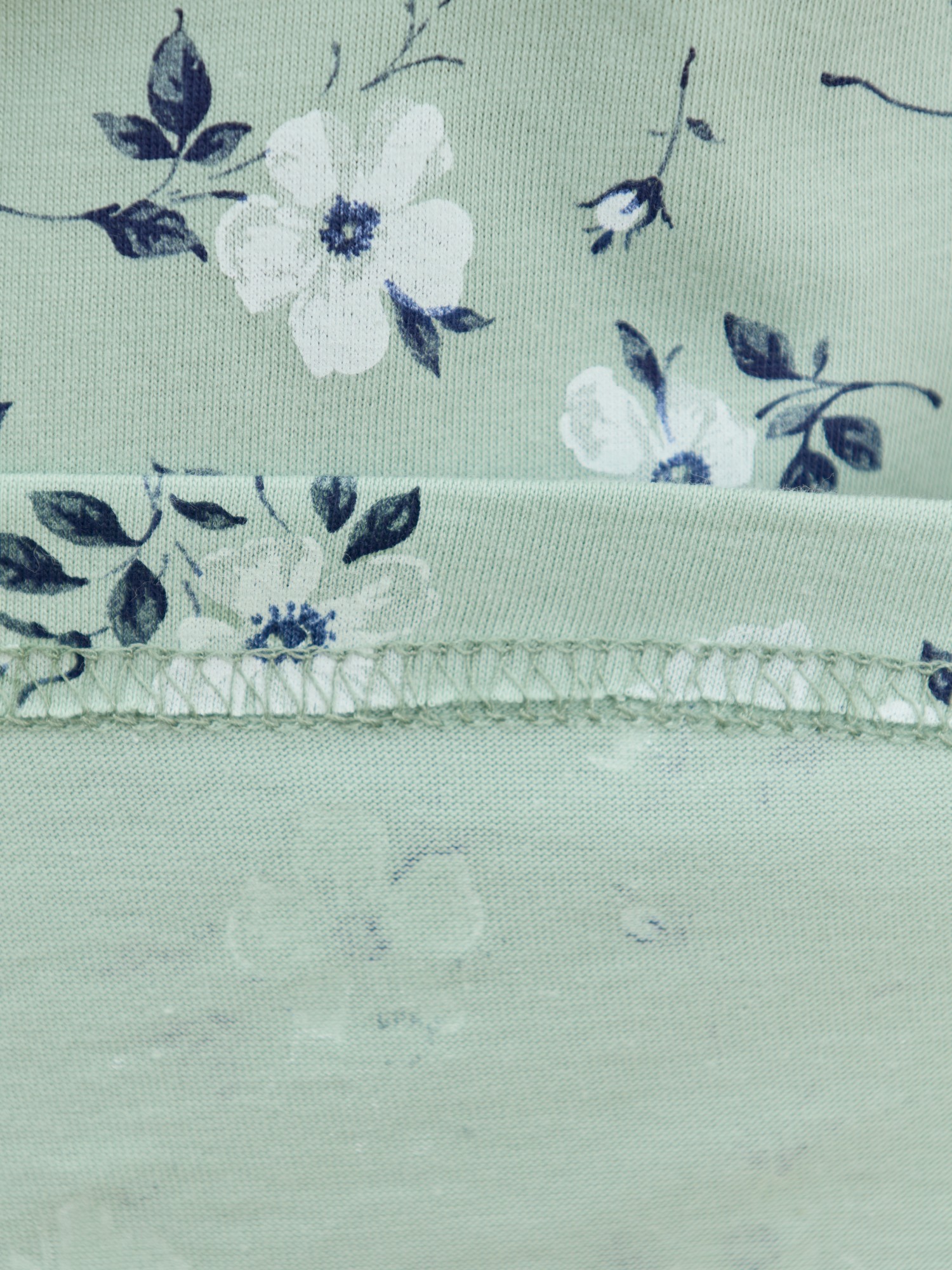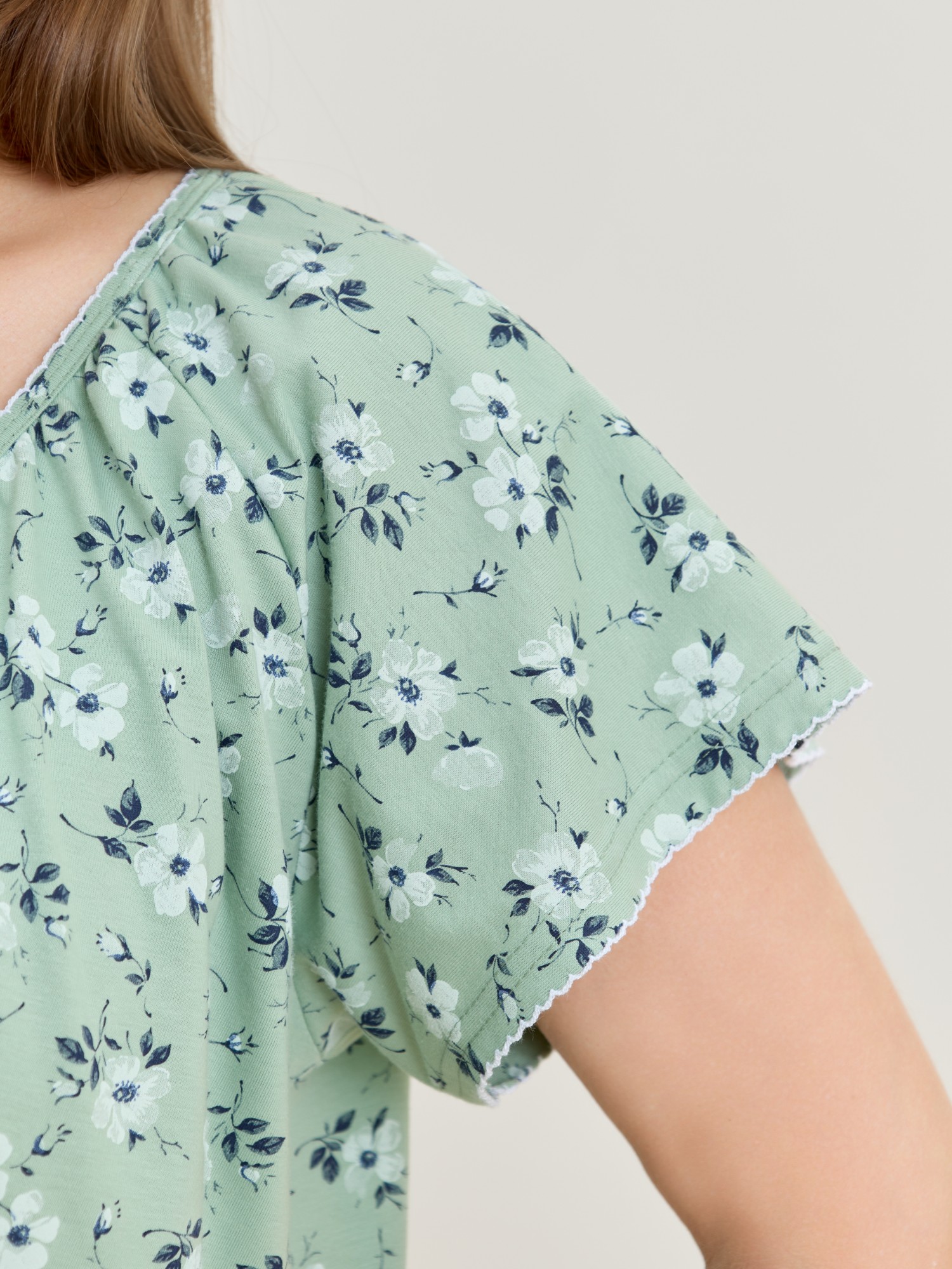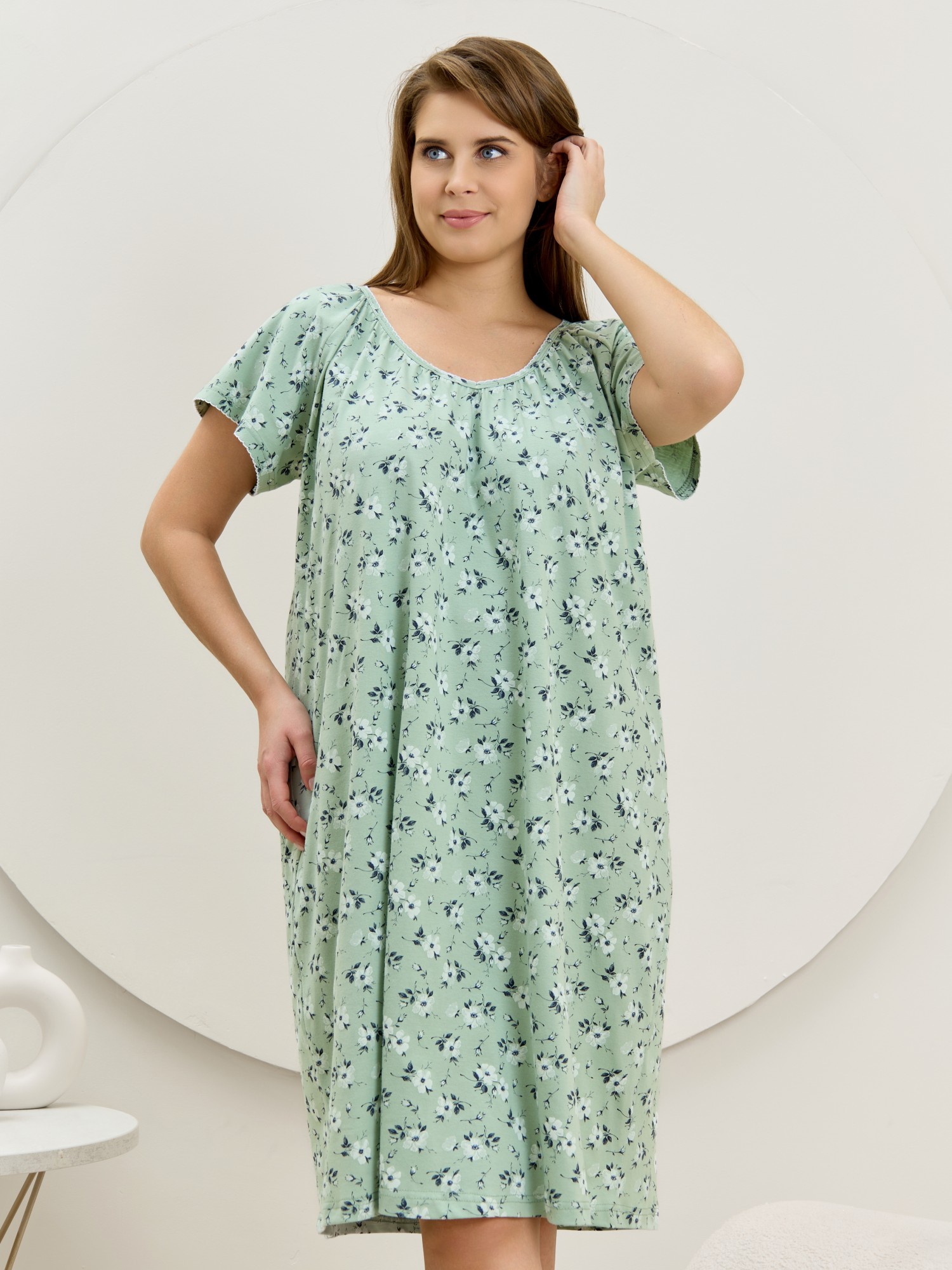 Сорочка женская из трикотажного полотна «кулирка» с набивным рисунком свободного покроя, с короткими втачными рукавами покроя «реглан». Углубленная горловина V- образной формы, собрана по краю на сборку и окантована основным материалом. Низ изделия и нижние срезы рукавов обработаны узким обметочным швом нитками в тон изделия.