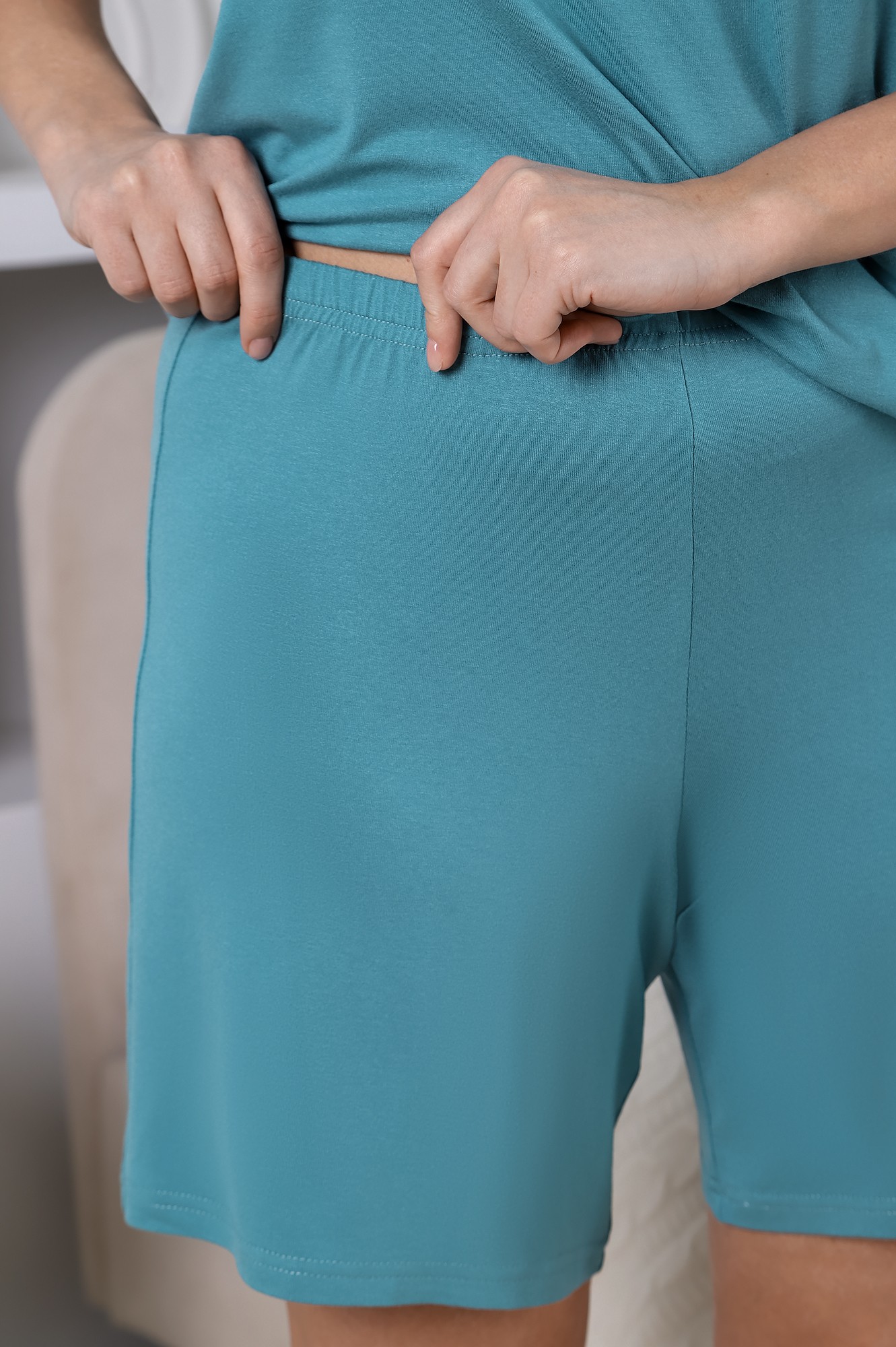 Пижама женская из гладкокрашенного вискозного полотна, состоящая из майки и шорт. Майка – слегка расширенная книзу, с углубленной горловиной овальной формы, без рукавов. Полочка с кружевными кокетками, образующими небольшой «запах». Проймы и горловина спинки окантованы основным материалом.Шорты – удлиненные, свободные, с эластичной тесьмой по талии.