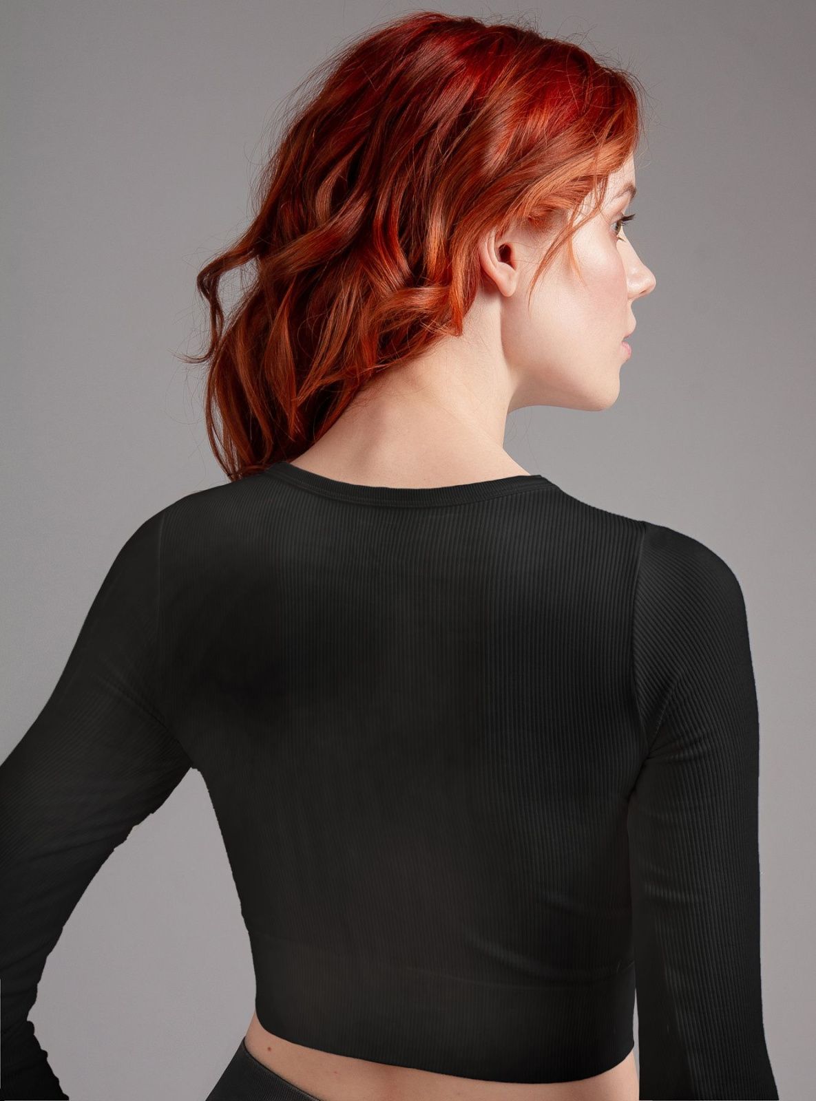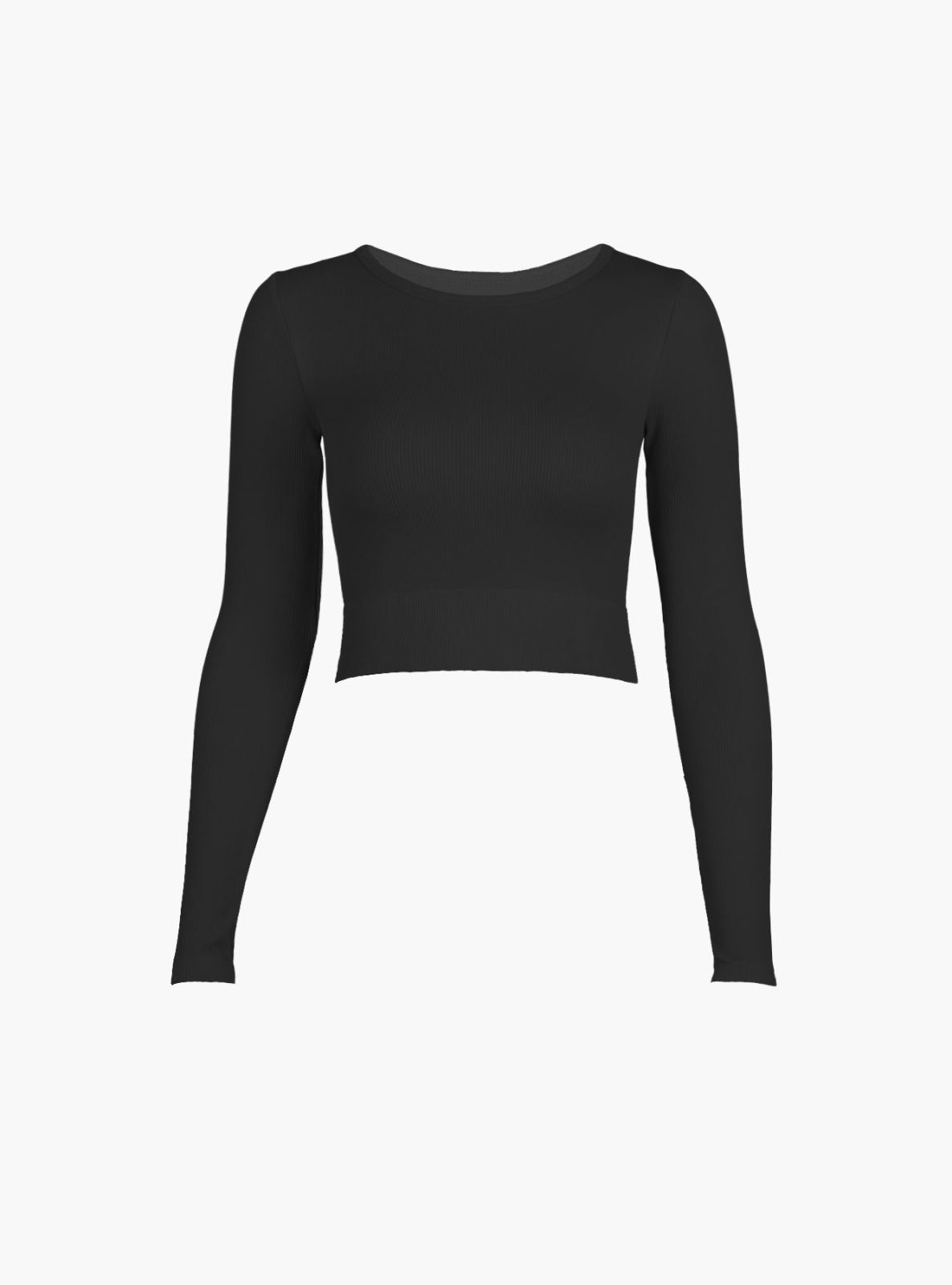 Лонгслив из полиамида, черного цвета, в рубчик, с длинными рукавами, облегающий, укороченный, на мягкой резинке."