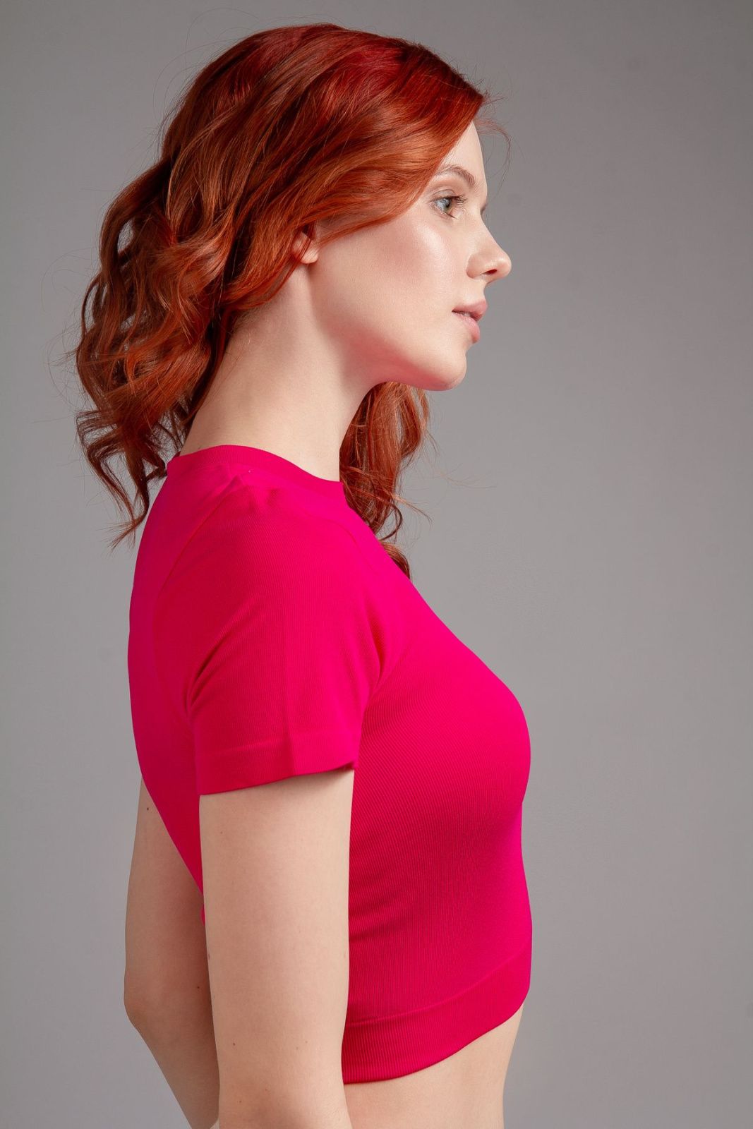 Футболка из полиамида, цвета фуксии, с короткими рукавами, с небольшим горлом, в рубчик, облегающая, укороченная.