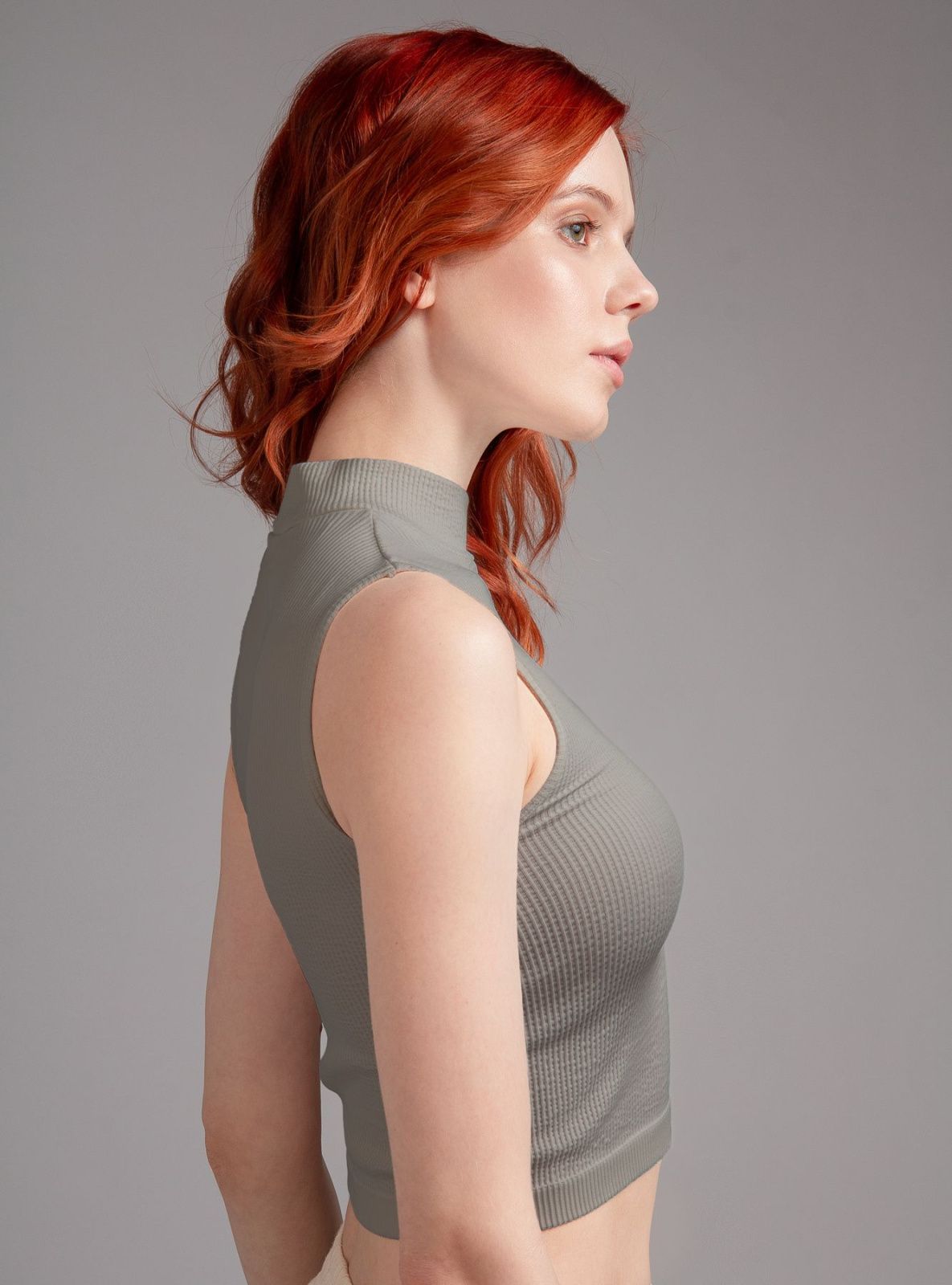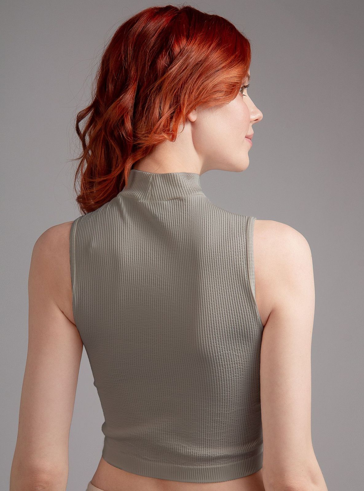 Майка-топ выполнена из полиамида песочного цвета, в рубчик, с высоким горлом, без рукавов, укороченная, облегающая, на мягкой резинке.