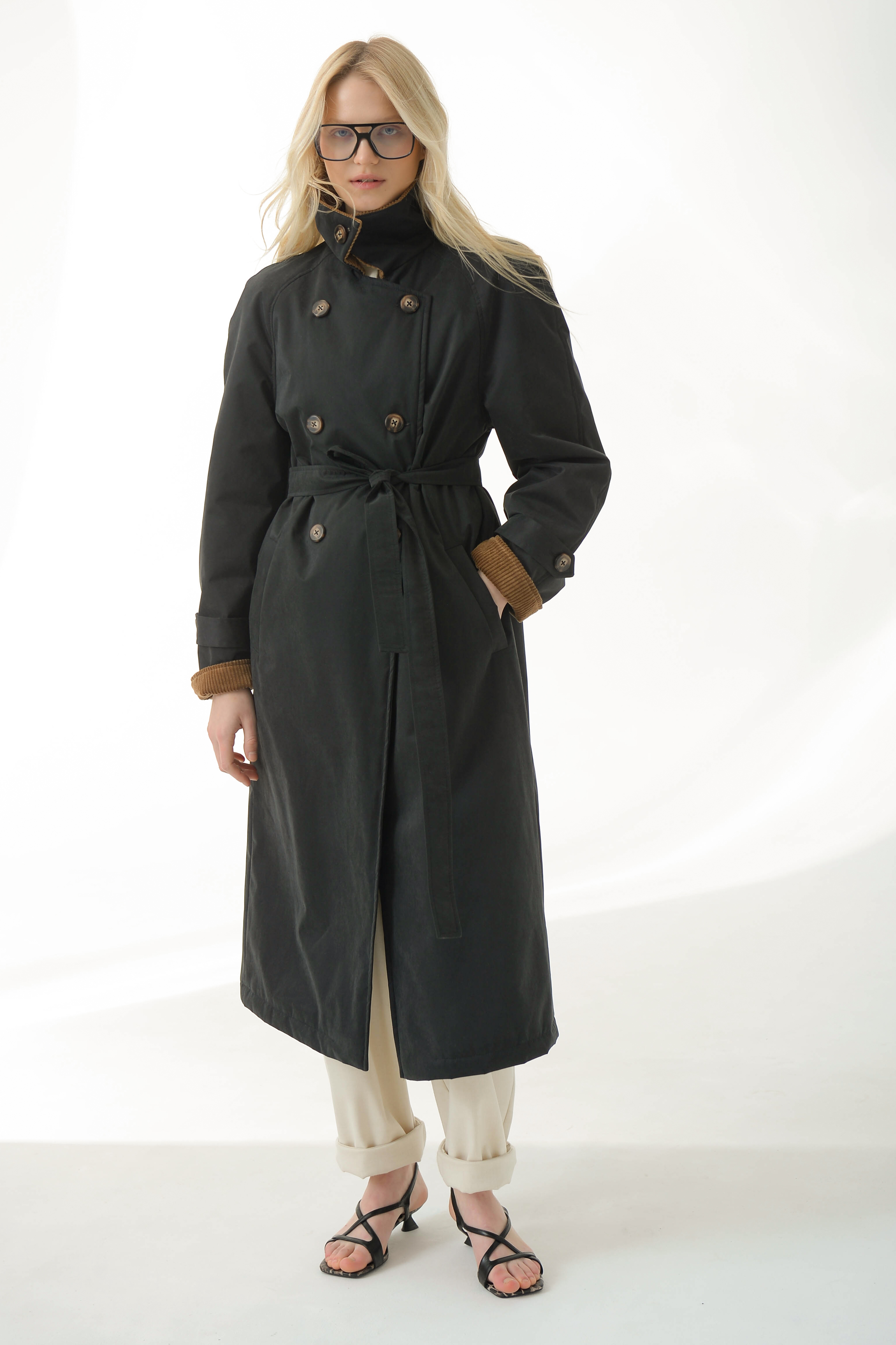 Легкий и комфортный утепленный плащ в черном цвете.Теплый, но без лишнего объема: внутри тонкий, невесомый, бельгийский утеплитель, идеально подходящий для межсезонья и прохладного лета.Для плаща мы выбрали плотную, с приятной велюровой текстурой верхнюю ткань. Ткань,благодаря пропитке, защитит от случайных осадков и ветра.Комфортная подкладка из поливискозы, внутренний функциональный карман.Высокий воротник можно зафиксировать пуговицей, а талию — подчеркнуть поясом. Верхняя ткань в контрасте с бархатистой текстурой вельвета добавляет изделию глубины и выразительности.Длину рукава можно регулировать подворотом из вельвета.