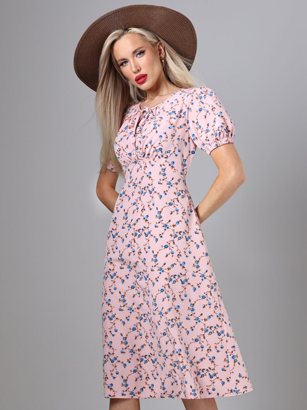 Это летнее платье с округлым вырезом на завязках и декоративной деталью в виде капли – прекрасный выбор для вашего гардероба на теплый сезон. Мягкая и легкая ткань обеспечивает приятное ощущение на коже, делая его идеальным вариантом для жарких дней. Короткие рукава на резинках добавляют платью легкости и свободы движения, позволяя вам чувствовать себя комфортно в любой обстановке. Расклешенная юбка создает воздушность и легкость образа, придавая ему женственный и игривый характер. Приталенный крой по фигуре подчеркивает естественные изгибы тела, помогая создать привлекательный и соблазнительный силуэт. Это платье подчеркнет вашу женственность и стиль, добавив нотку изыска и элегантности вашему образу. Надевайте это платье на свидания, прогулки или вечерние мероприятия, и вы будете выглядеть непревзойденно стильно и привлекательно в любой ситуации.