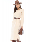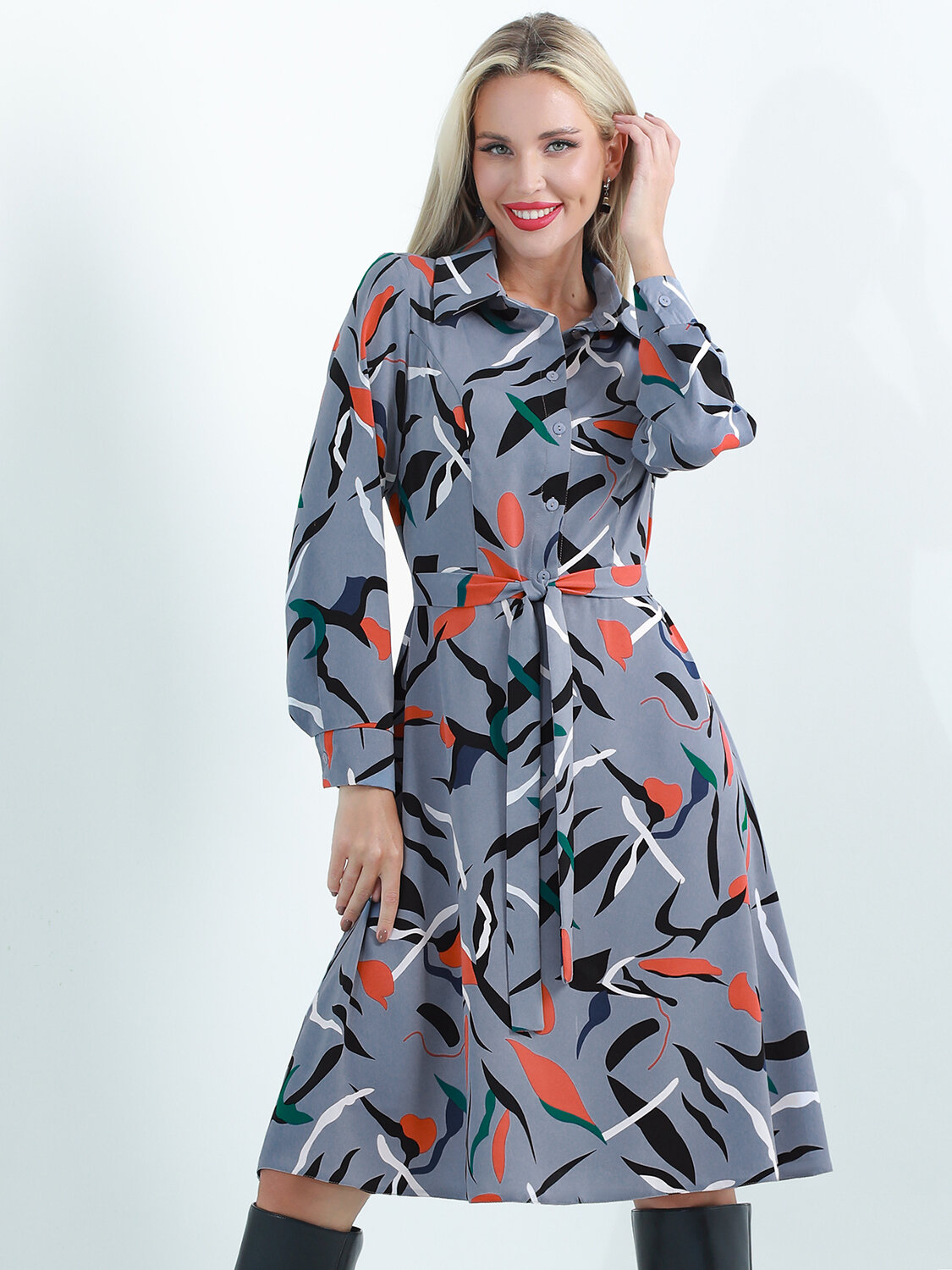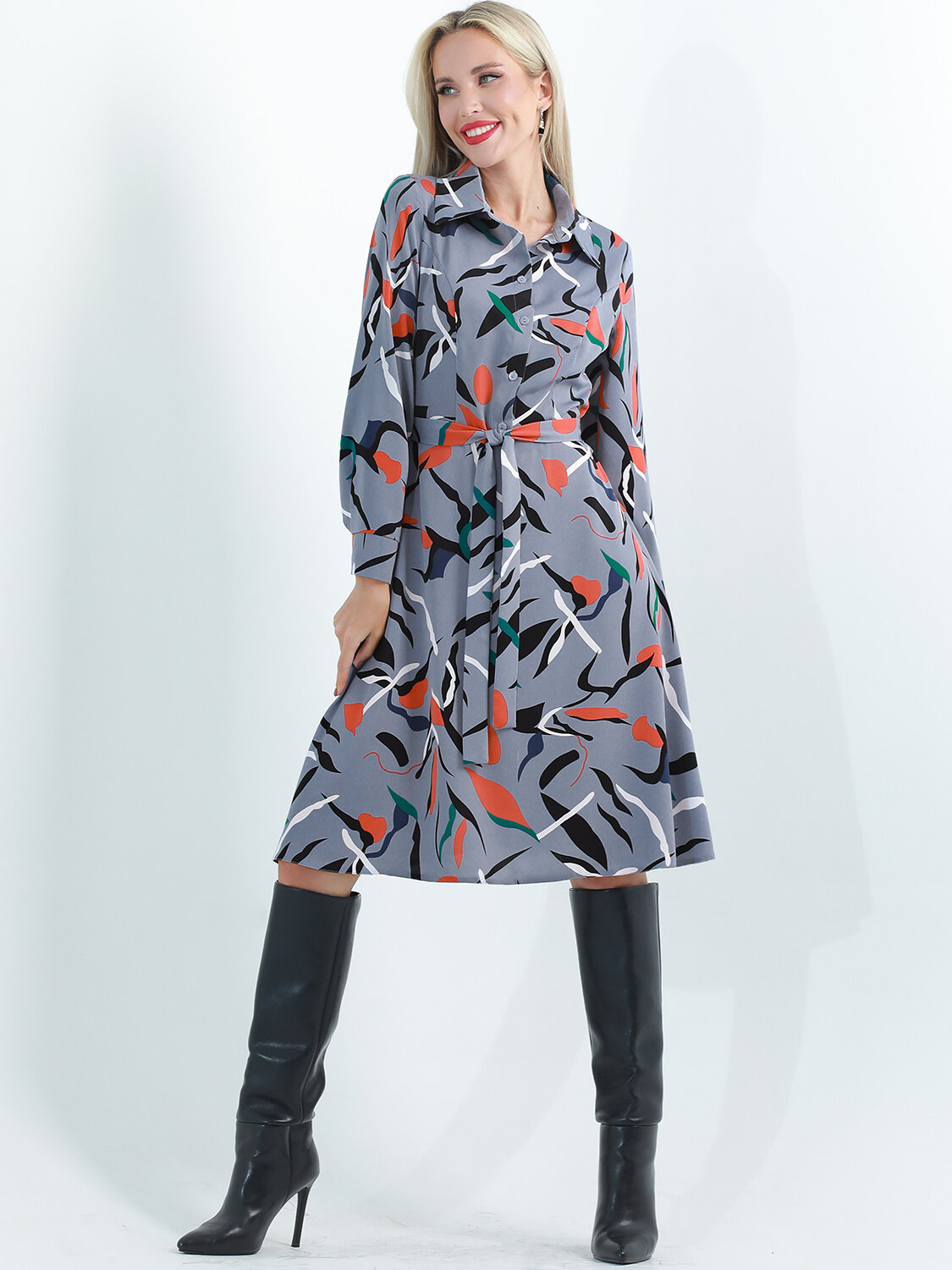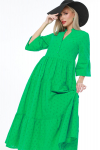 Роскошное вечернее платье из струящейся ткани превратит вас в королеву! Модель имеет рубашечный воротник, который придает образу строгости и элегантности. Длинные рукава и расклешенная юбка выглядят действительно богато. Завершает образ пояс в тон. Достойно красной дорожки!