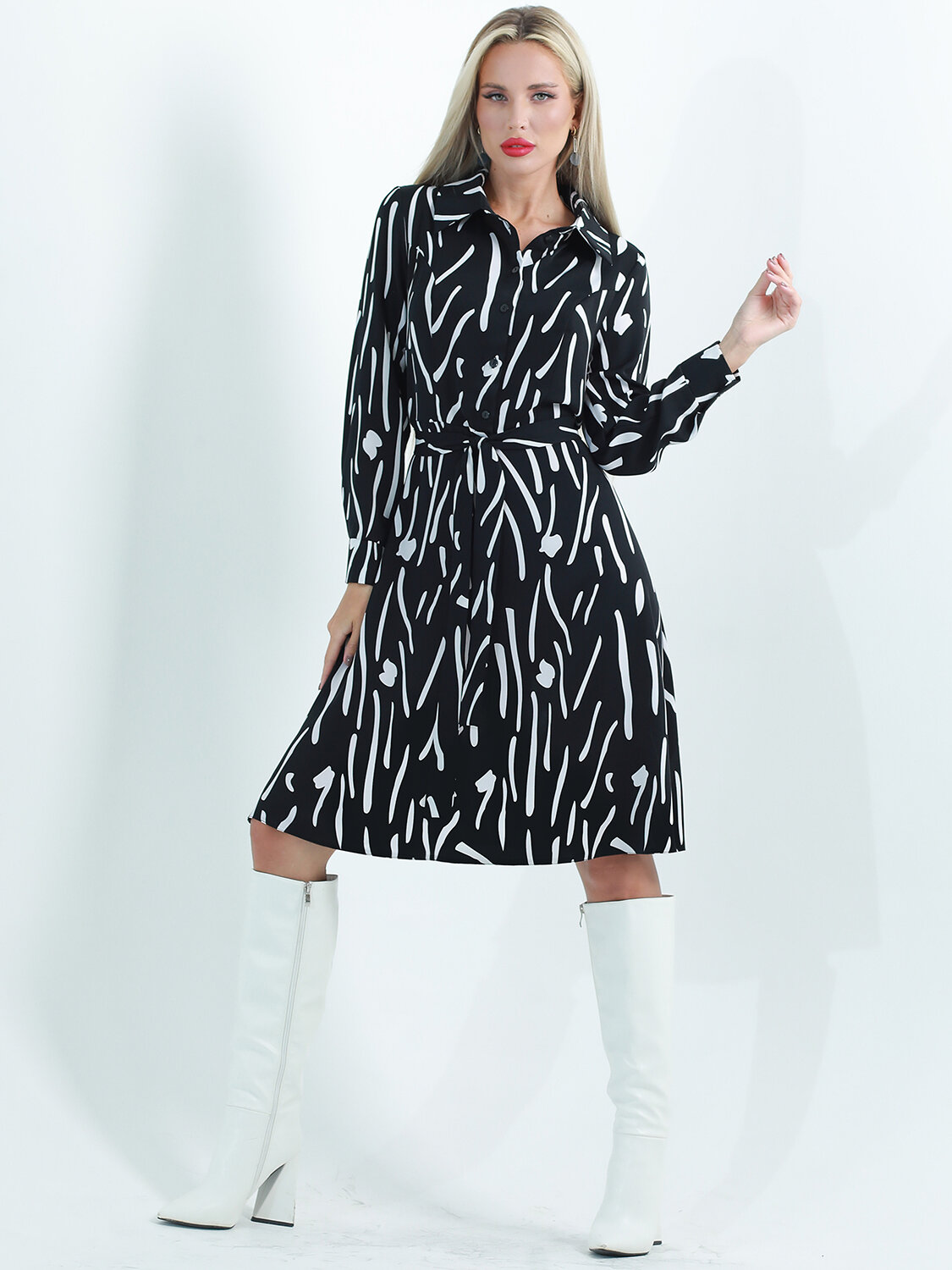 Роскошное вечернее платье из струящейся ткани превратит вас в королеву! Модель имеет рубашечный воротник, который придает образу строгости и элегантности. Длинные рукава и расклешенная юбка выглядят действительно богато. Завершает образ пояс в тон. Достойно красной дорожки!