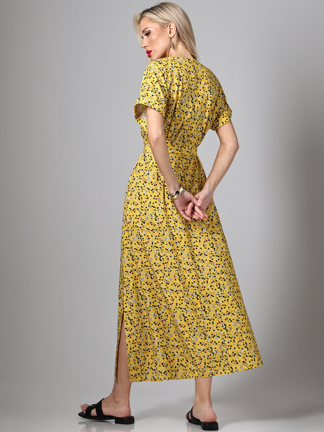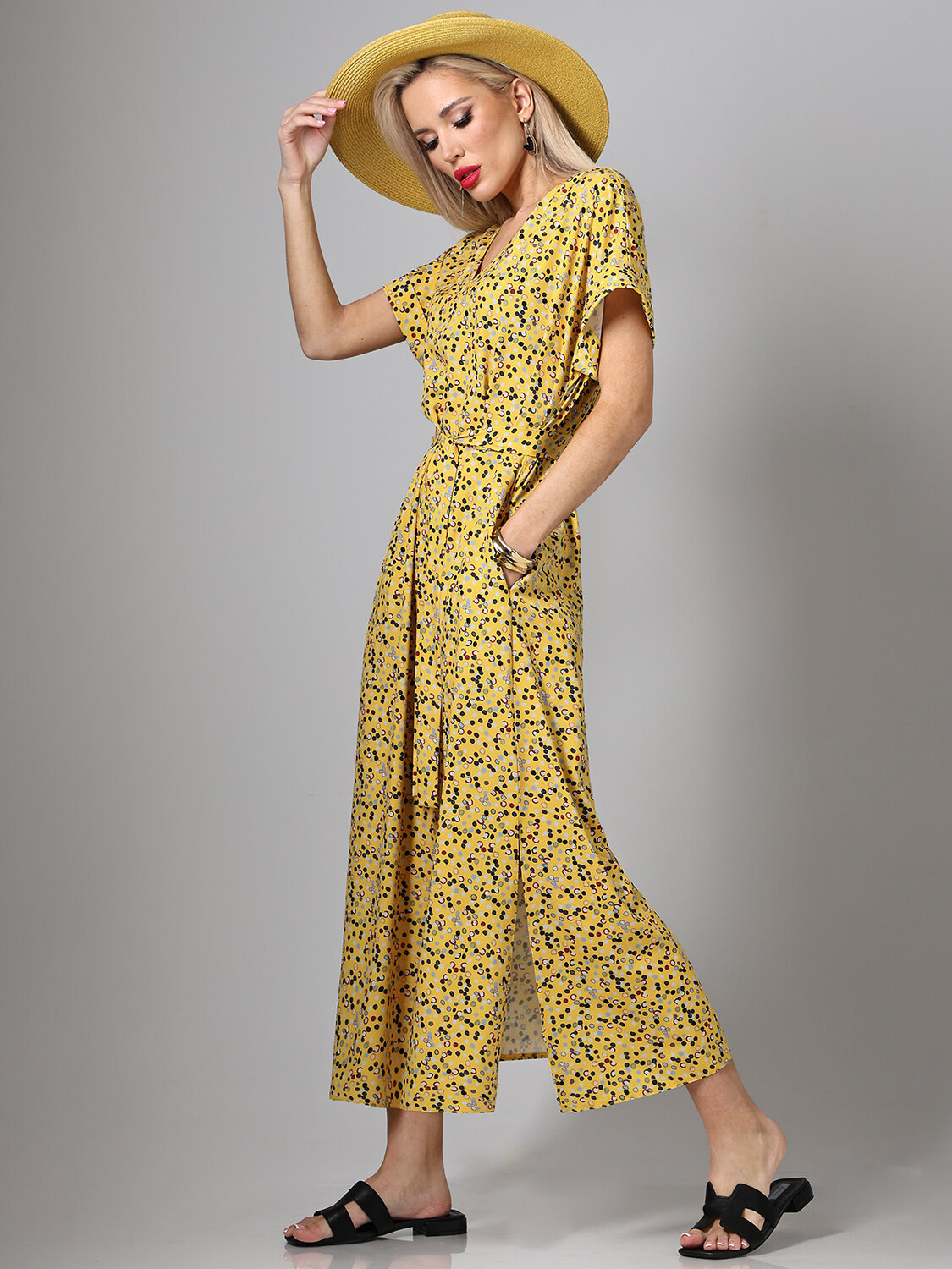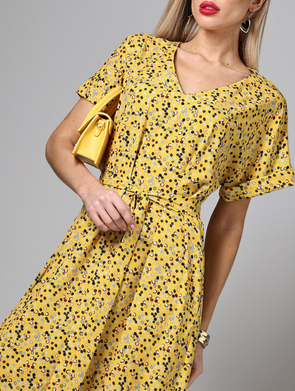 Длинное летнее платье желтого цвета выполнено из плательной ткани, обеспечивающей комфорт в жаркую погоду. Модель имеет А-силуэт, который создает женственный и свободный крой, подходящий для разных типов фигур, включая большие размеры. V-образный вырез горловины добавляет образу элегантности, а короткие рукава обеспечивают удобство в летний период. Декоративный пояс подчеркивает талию, позволяя регулировать посадку по фигуре. Платье предназначено для повседневной носки и сочетается с различными аксессуарами и обувью. Уход за изделием требует бережной стирки при температуре 30 градусов, что помогает сохранить качество ткани и форму платья. Желтый цвет делает модель универсальной и подходящей для разных случаев, от прогулок до неформальных встреч. А-силуэт платья создает плавные линии, визуально вытягивая фигуру.