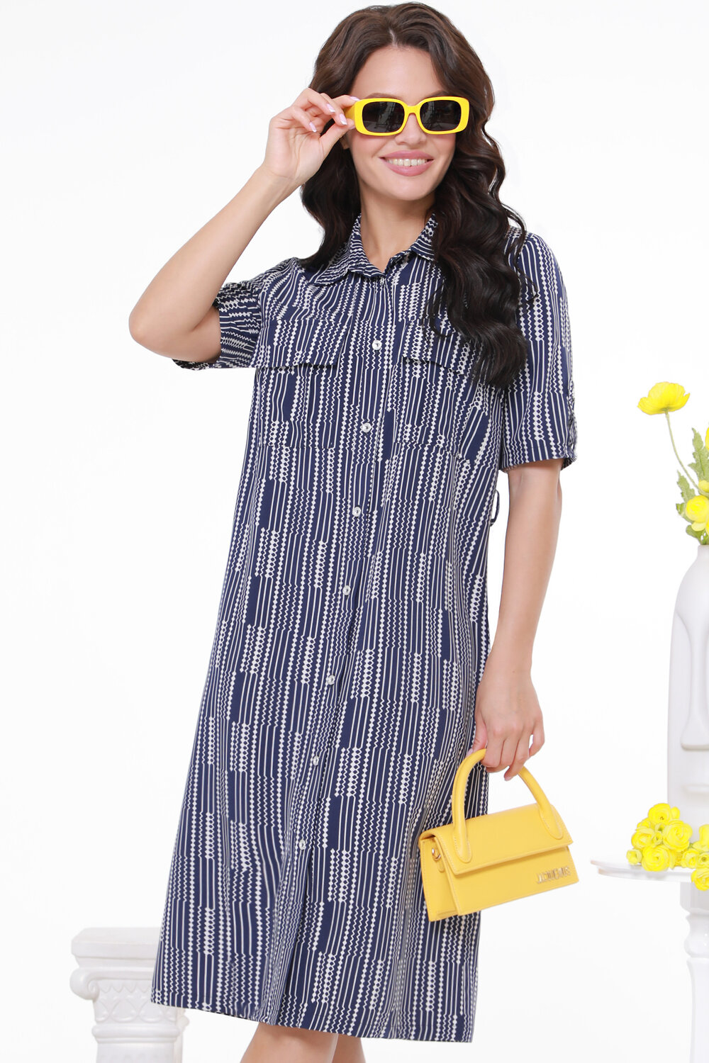 Универсальное платье-рубашка на любой случай. Полноценная застежка делают платье удобным в надевании и безопасным для макияжа и прически. Сорочечный фасон воротника придает платью элегантность, а пояс подчеркивает талию. Прекрасный выбор на лето!