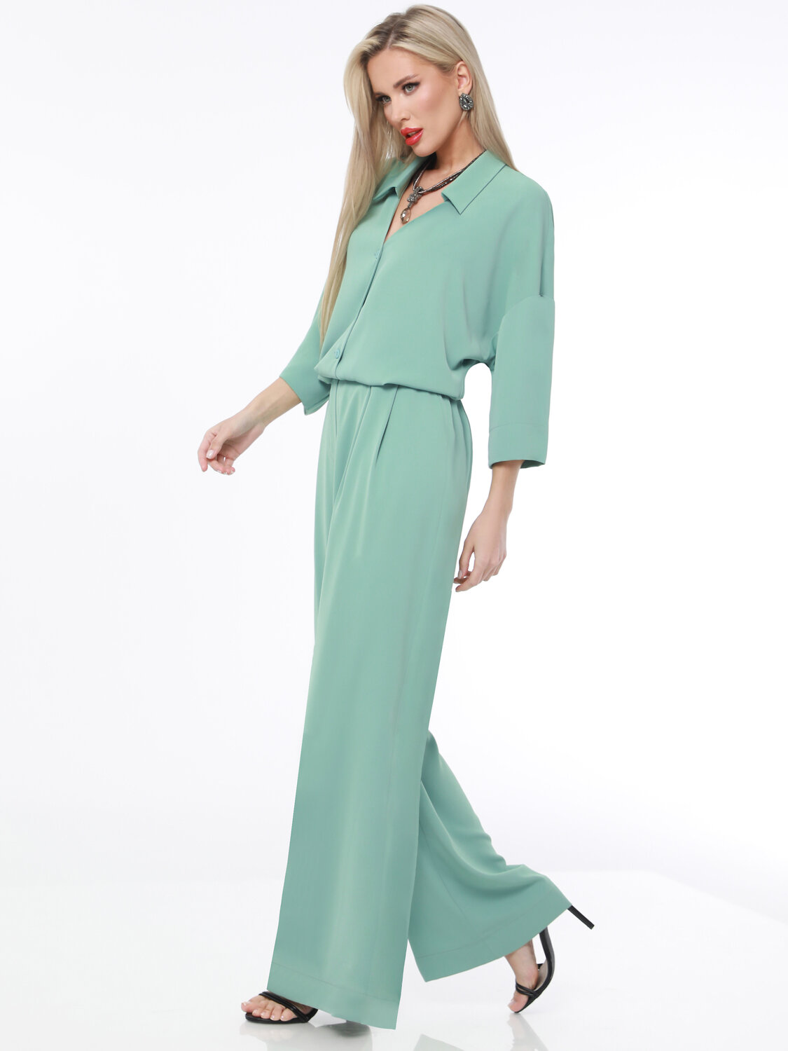 Элегантный и универсальный костюм для любых событий. Блузка с рубашечным воротником и фигурным вырезом горловины придаёт изысканность, а цельнокроеный укороченный рукав создаёт ощущение лёгкости. Брюки прямого кроя с резинкой на спинке и защипами спереди обеспечивают комфорт и элегантность. Костюм легко адаптируется под разные ситуации: для деловых встреч можно дополнить его туфлями-лодочками и небольшой сумкой для строгого и профессионального образа.