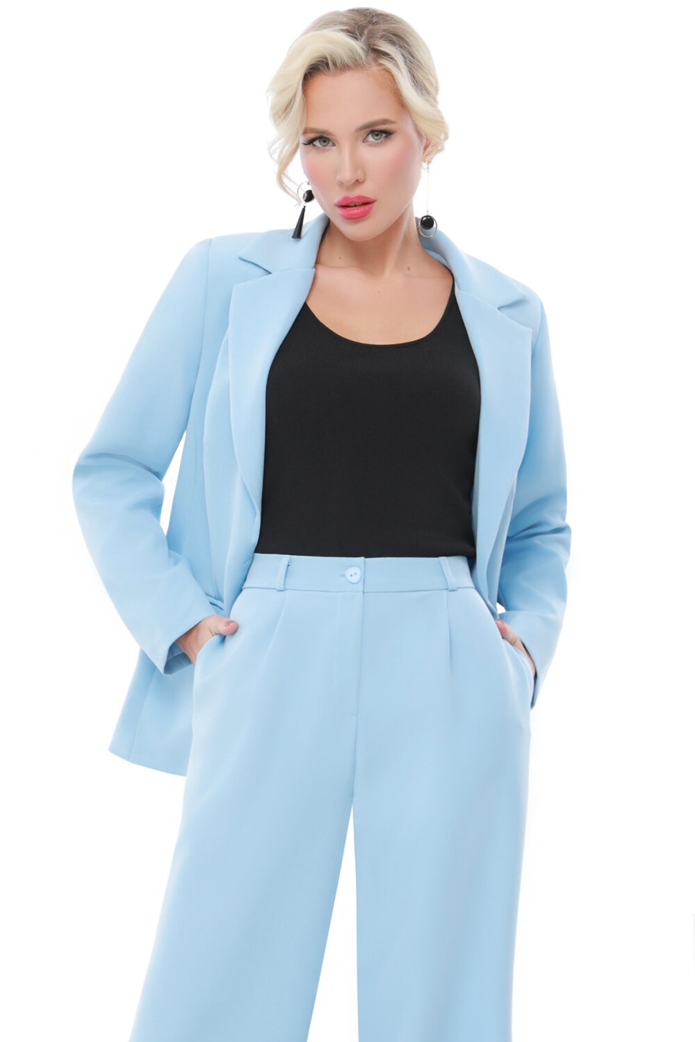 Брючный деловой костюм — элегантная модель на все времена, которая будет роскошно смотреться как на работе, так и на вечернем мероприятии. Жакет прямого кроя с застежкой на пуговицу не только соответствует последним модным тенденциям, но и помогает сгладить нюансы фигуры. Два кармана с клапанами по бокам функциональны и не добавляют лишнего объема. Стильным дополнением к жакету становятся широкие прямые брюки полной длины с высокой посадкой. Модель не сковывает движений, визуально вытягивает силуэт и создает эффект летящей походки. При желании брюки можно дополнить кожаным ремешком, чтобы подчеркнуть талию и стильно завершить образ. Комплект выполнен из качественной приятной к телу костюмной ткани, которая практически не мнется и слегка тянется. Рекомендуется стирать изделие в деликатном режиме при температуре до 30 градусов без отжима.