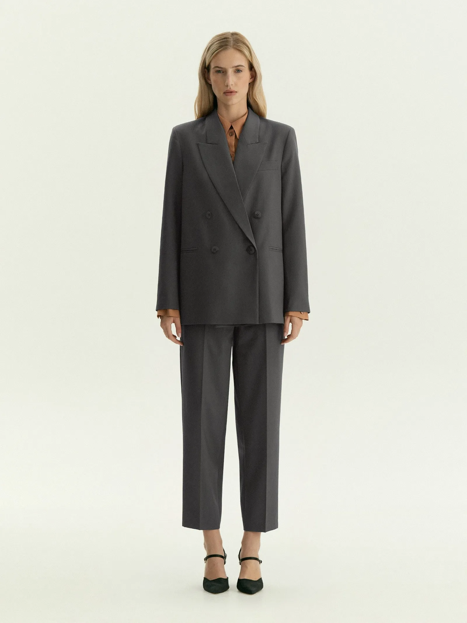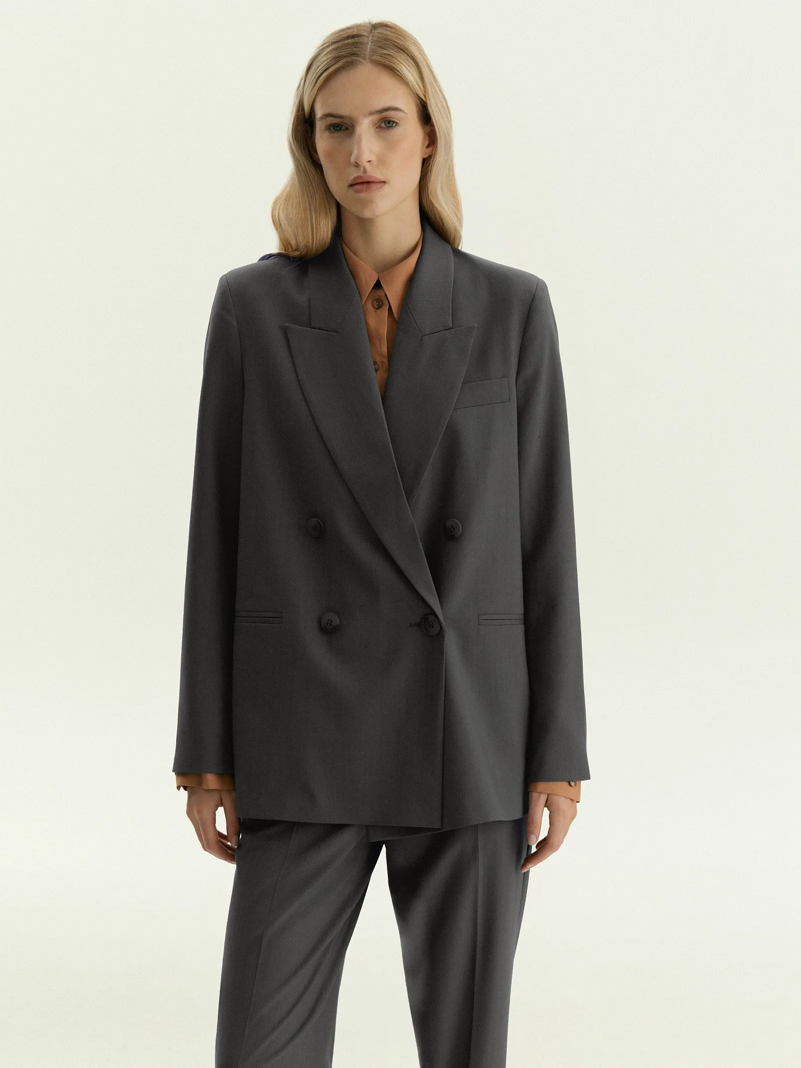 Жакет в цвете графита для повседневных образов и не только. Материал на четверть состоит из натуральной шерсти и содержит эластан. Удлинённая двуборная модель имеет универсальный прямой крой. Дополнена английским воротником. Завершить образ можно брюками из комплекта. Изделие выполнено на подкладке с высоким содержанием вискозы.