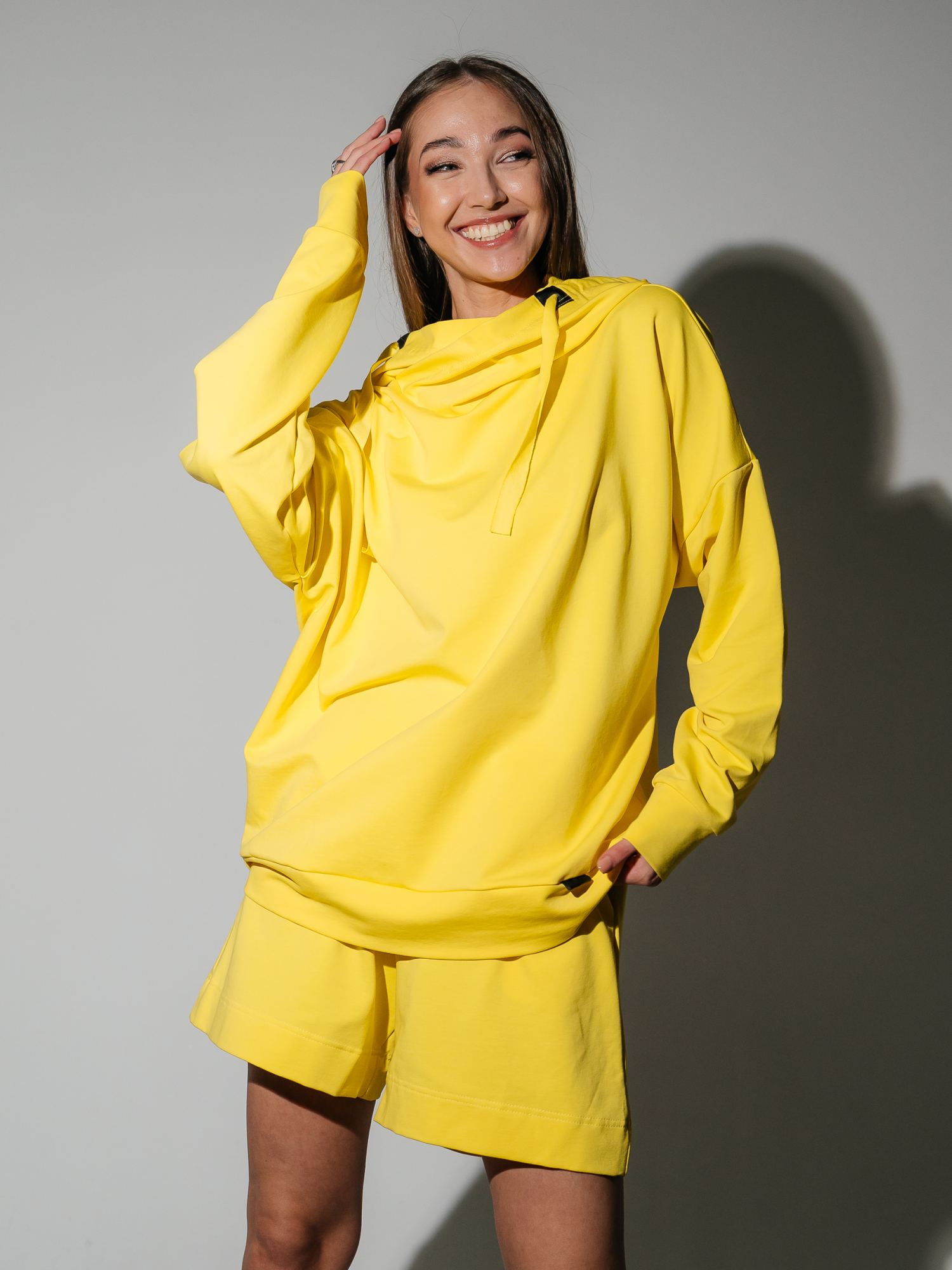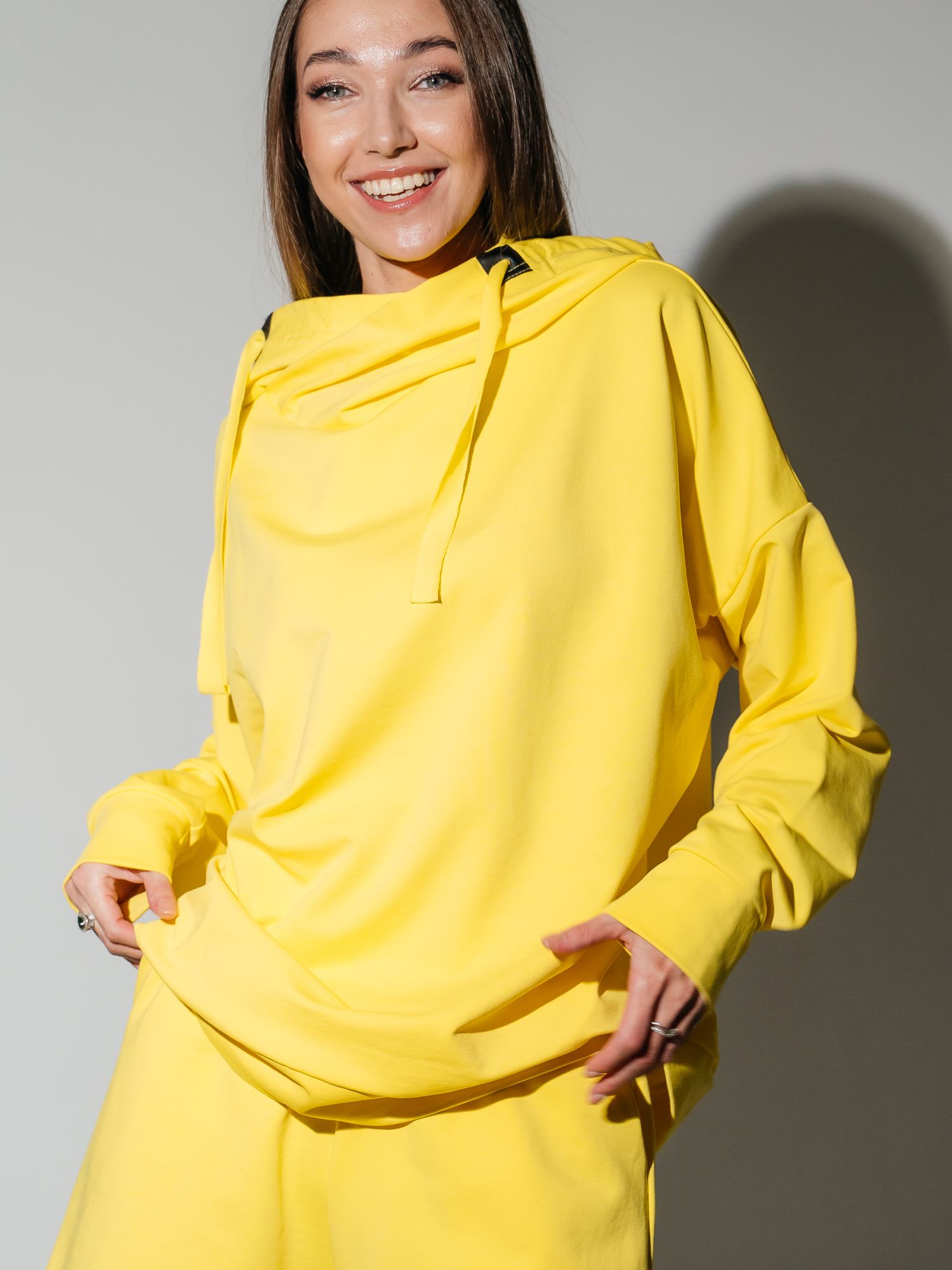 Худи из футера лимонного цвета свободного силуэта с объемным капюшоном и длинными рукавами. Низ и рукава на манжетах. На капюшоне отделочные элементы из эко-кожи. Изделие выполнено из трикотажа премиального качества - ПЕНЬЕ, с содержанием хлопка более 92%