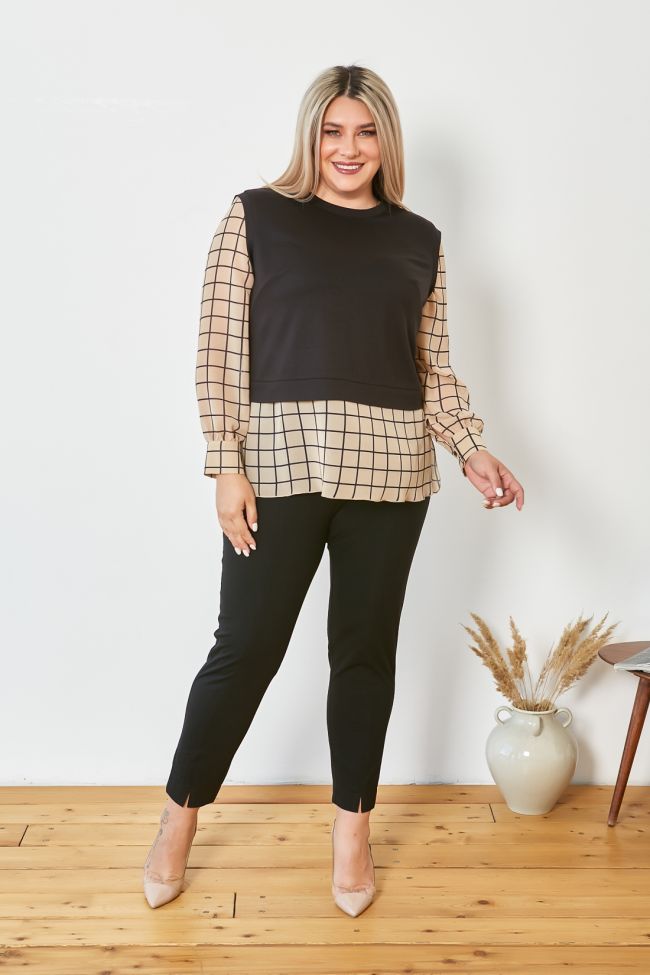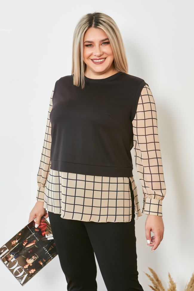 Рукава и нижняя часть изделия выполнены из шифона в принт «крупная клетка».