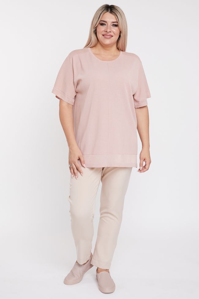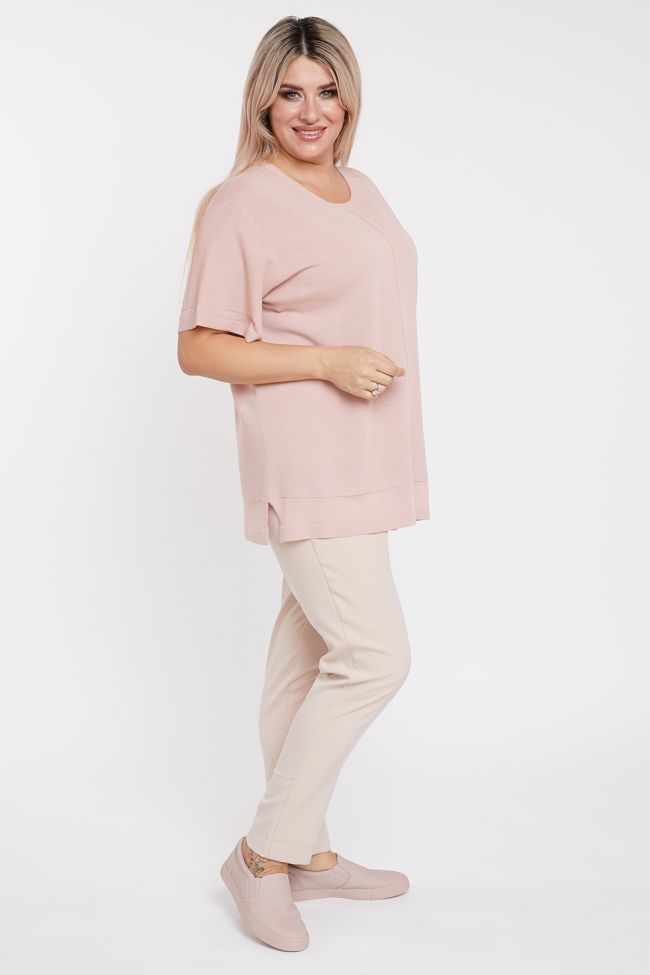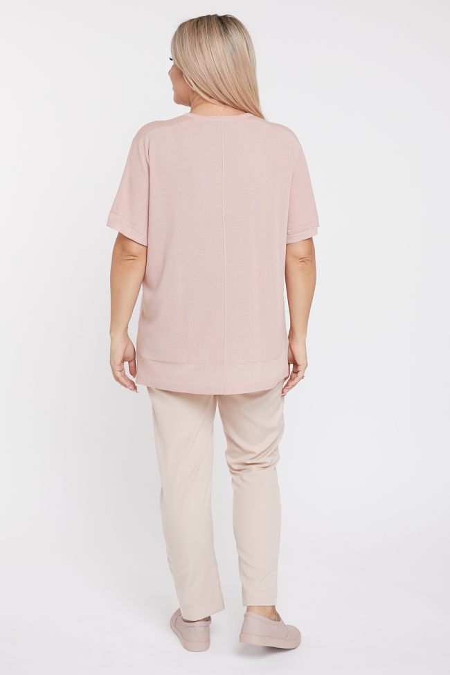 розовый Удобный джемпер прямого силуэта из вязанного трикотажа. Круглый вырез горловины обработан прикетлеваной бейкой. По центру переда и спинки имитация шва. Рукава втачные, длиной до уровня локтя, расширены к низу и дополнены разрезом по шву. В виде отделки, по низу рукава ажурная вставка, по плечевым швам и низу вставка из полупрозрачного трикотажа.  Низ ровный, по бокам разрезы.